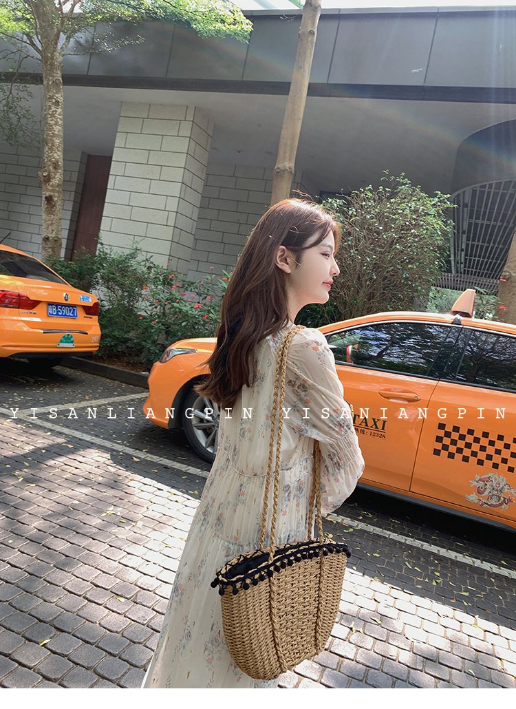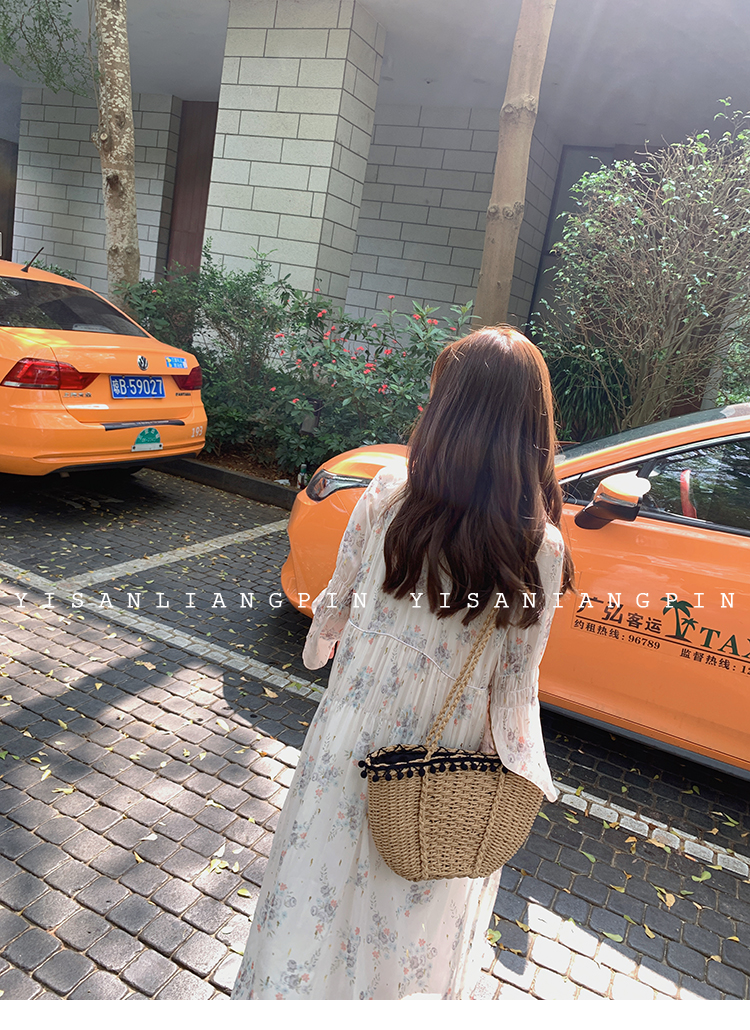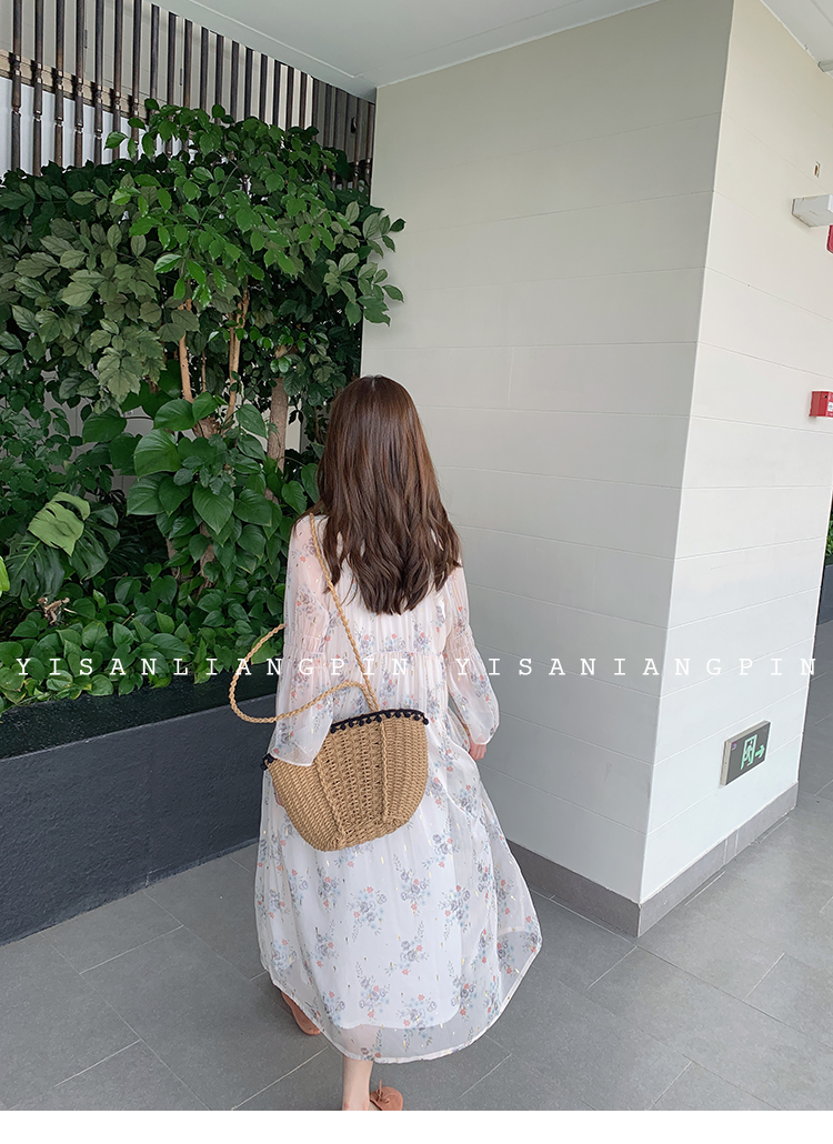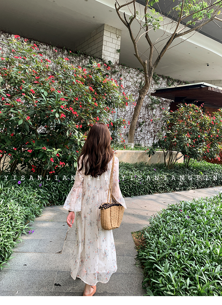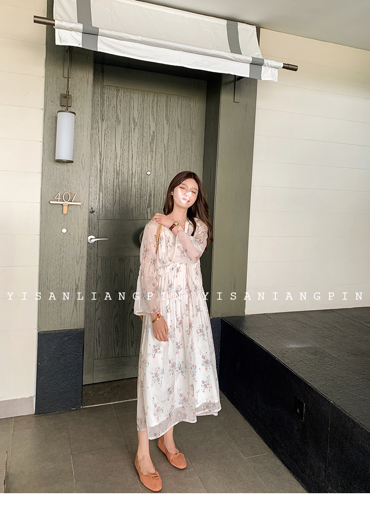 粉黛子~溫柔仙氣飄逸v領長袖碎花雪紡連衣裙中長款度假裙女小個子