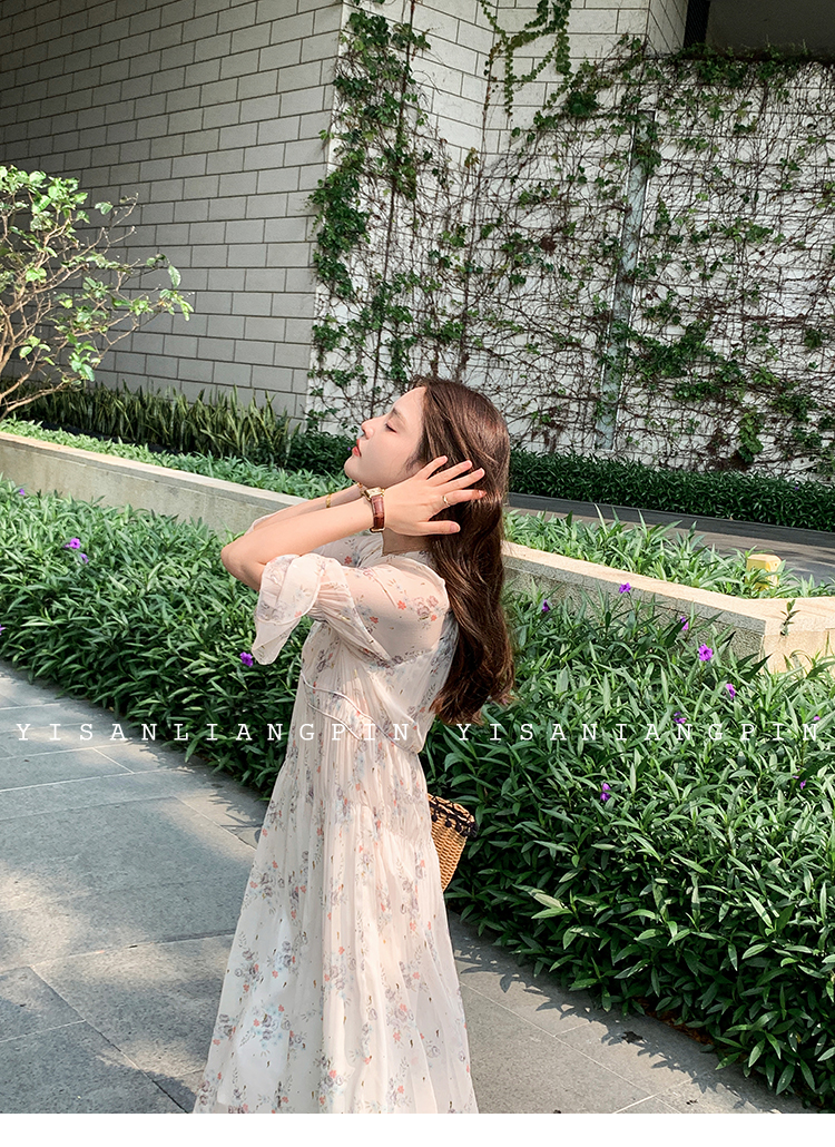 一三良品小個子 夏日花和風 仙女裙溫柔風喇叭長袖碎花雪紡連衣裙