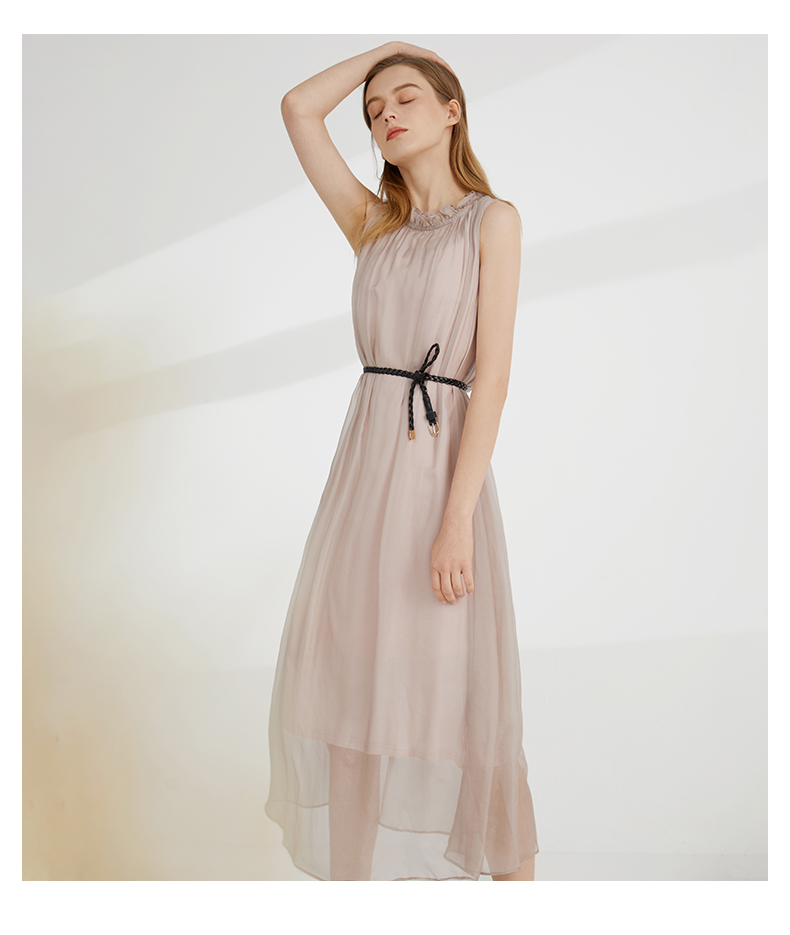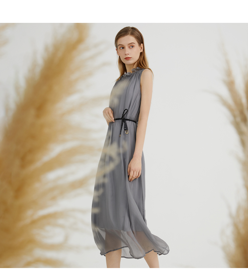 灰色無袖真絲連衣裙女中長款2023夏季新款桑蠶絲收腰木耳邊長裙仙