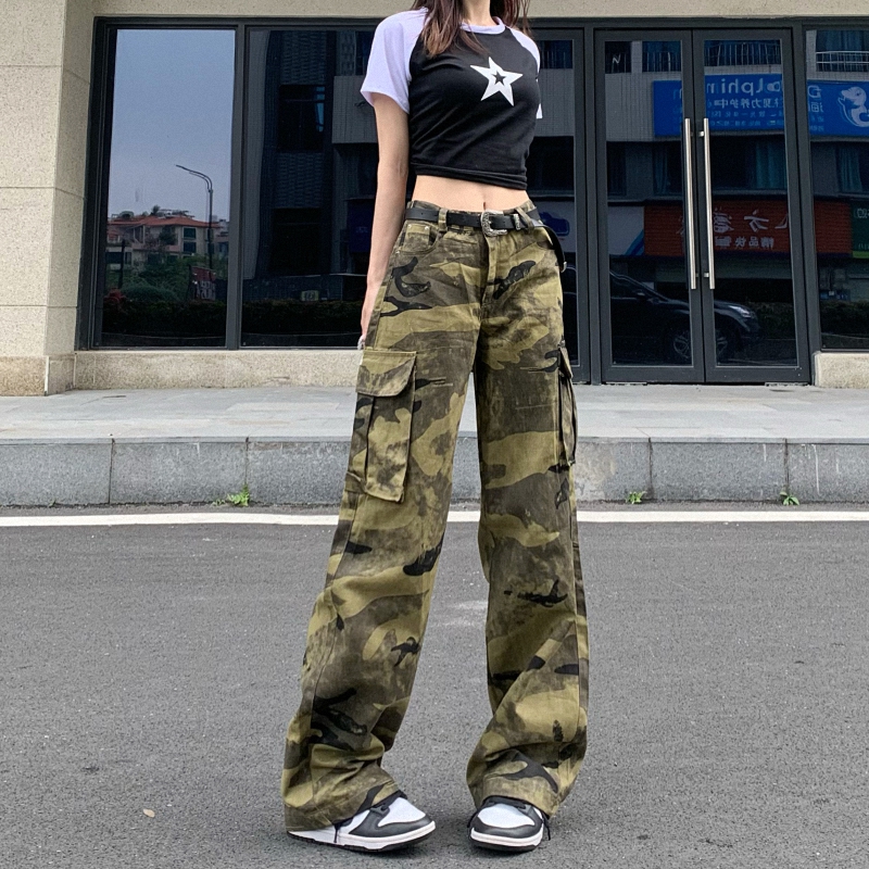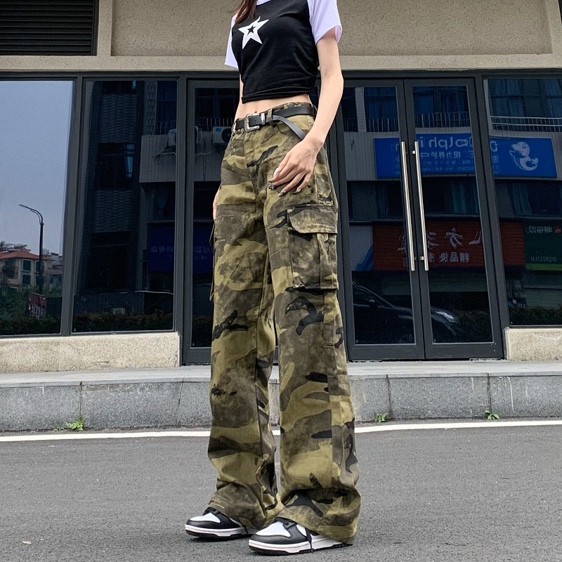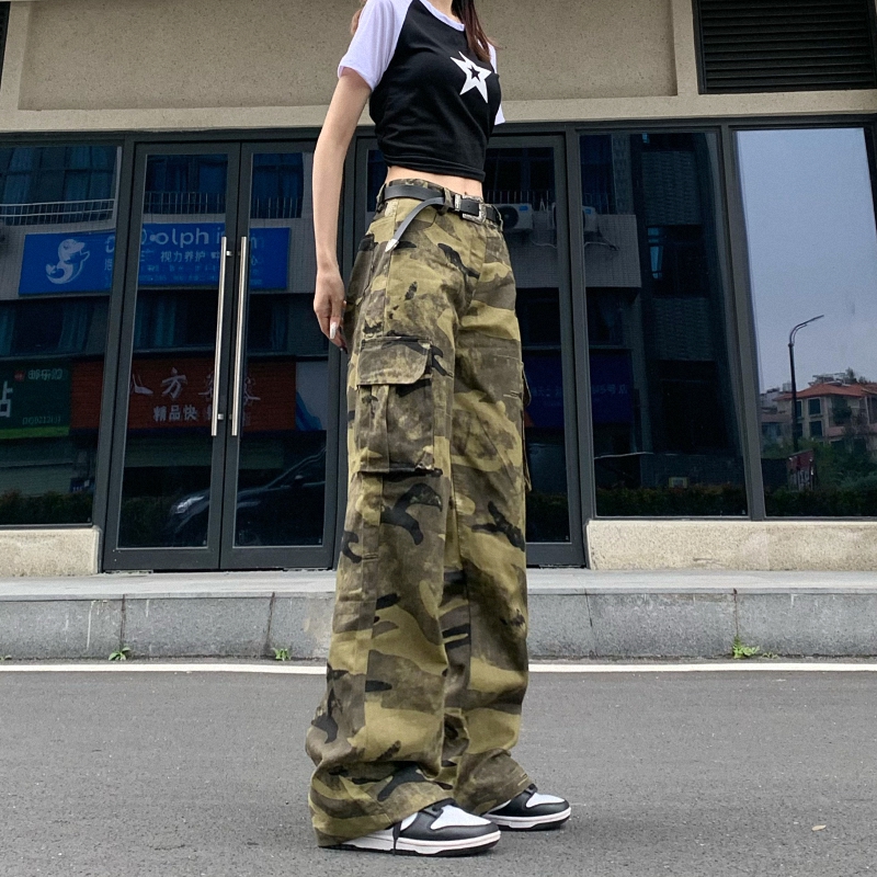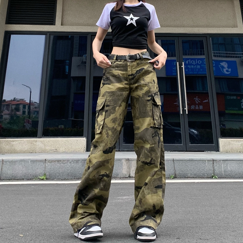 媽個雞媽 ins美式直筒迷彩復古多口袋工裝褲寬松男女褲子休閑褲潮