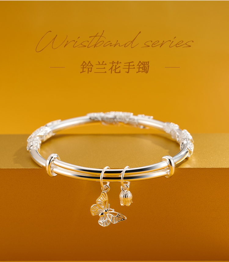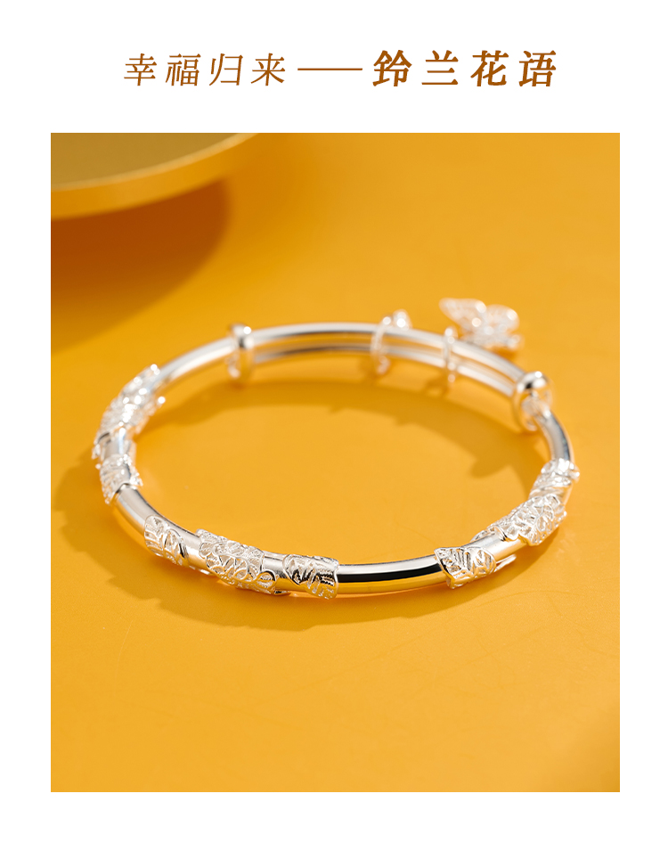 順欽銀樓S9999純銀手鐲女鈴蘭花足銀鐲子送愛人紀念禮物古風銀飾