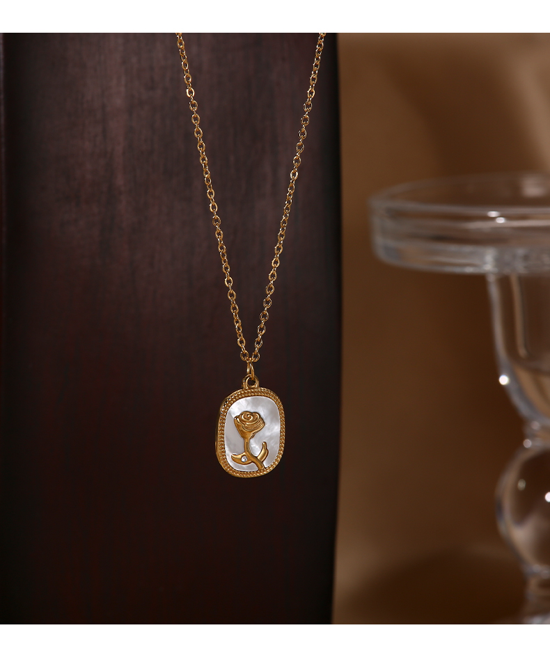 t鈦鋼玫瑰花牌項鏈吊墜白貝殼百搭鎖骨鏈 送女友閨蜜生日禮物通勤