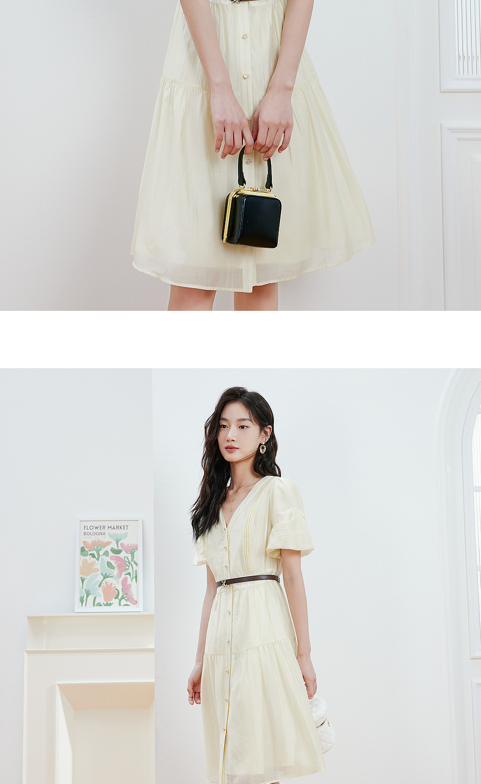 天絲泡泡袖連衣裙女2023年夏季新款高級感寬松遮肚子法式腰帶裙子