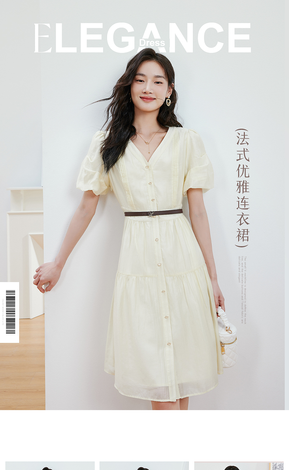萊賽爾蕾絲連衣裙女衣香麗影2023夏季新款v領顯瘦減齡泡泡袖裙子