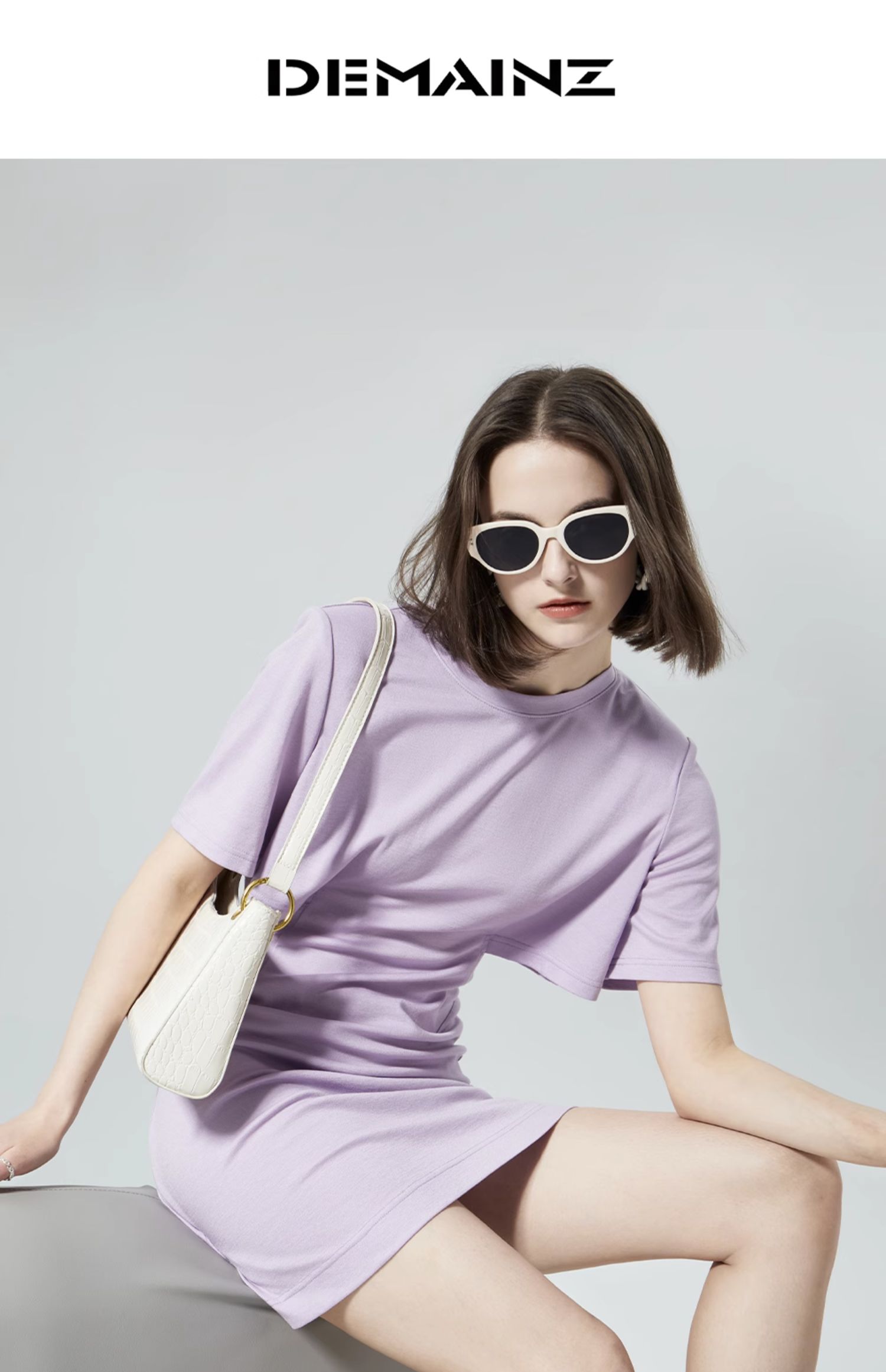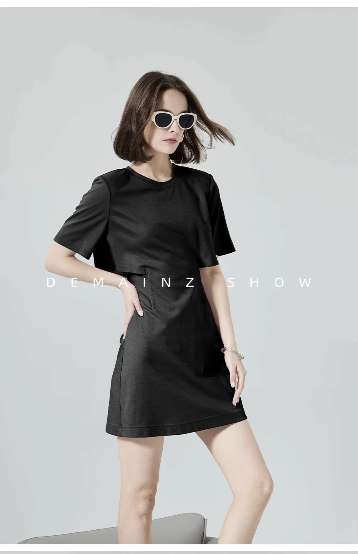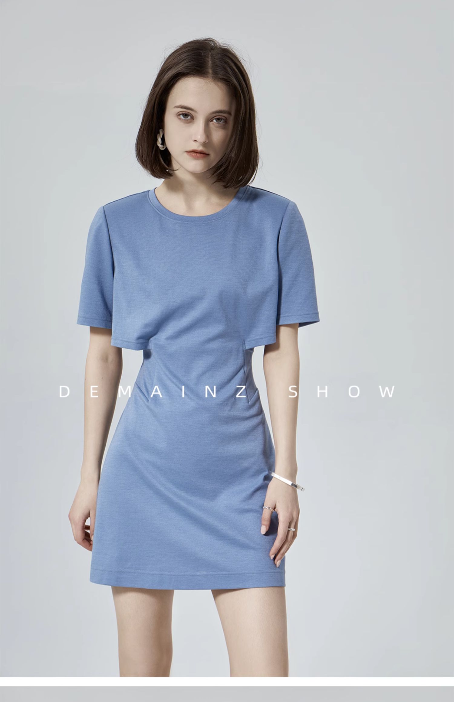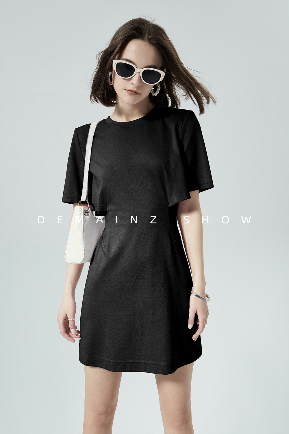 DEMAINZ地縵圓領短袖修身連衣裙夏季2023女套頭法式簡約純棉新款