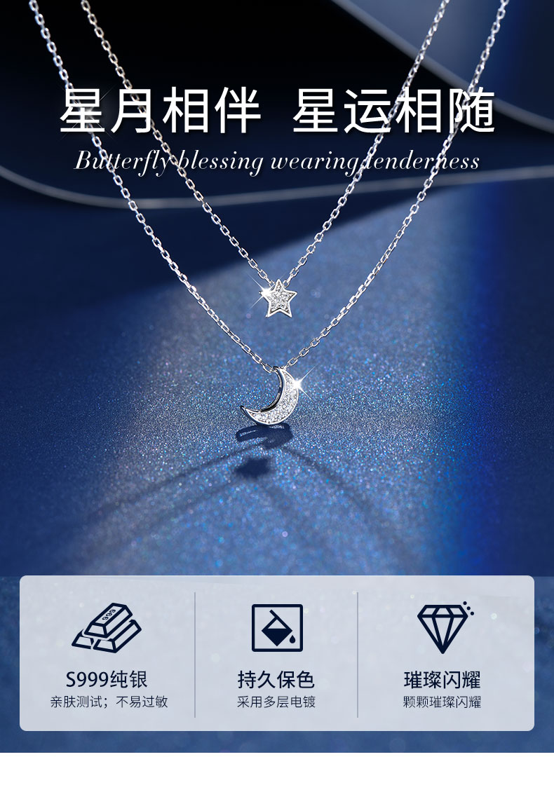 雙層星月999純銀項鏈女ins閃鉆星星月亮鎖骨鏈小眾設計送朋友禮物