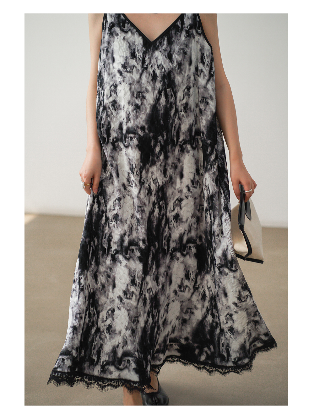菲爾丹 國風氣質復古吊帶連衣裙 暈染水墨色睫毛蕾絲超長裙2305