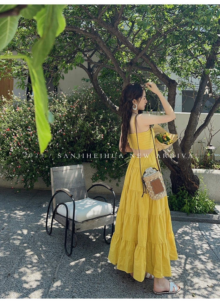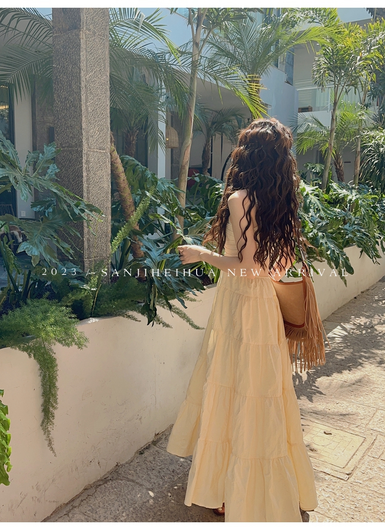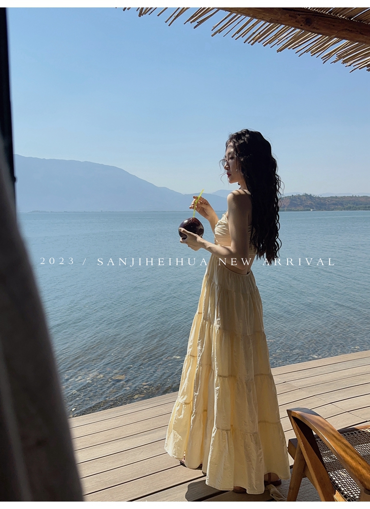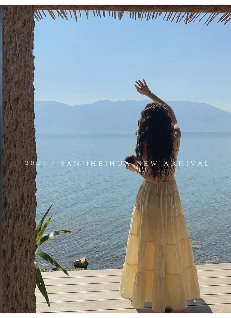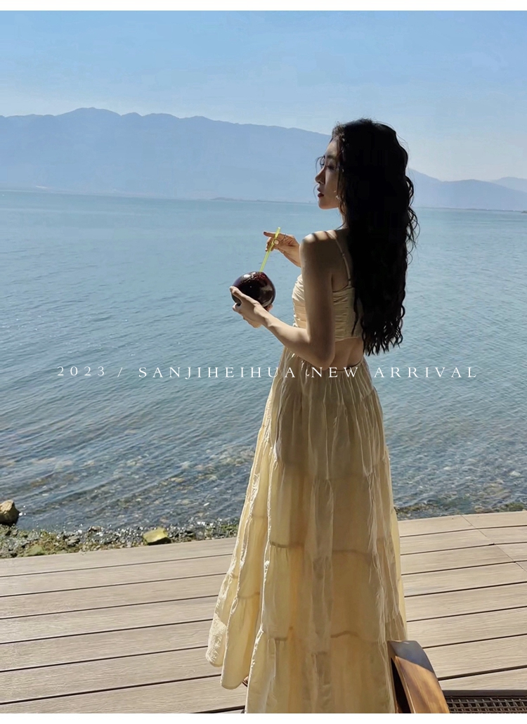 魅影仙女 大擺長裙在逃公主海邊女生v領裙子度假風露背吊帶連衣裙