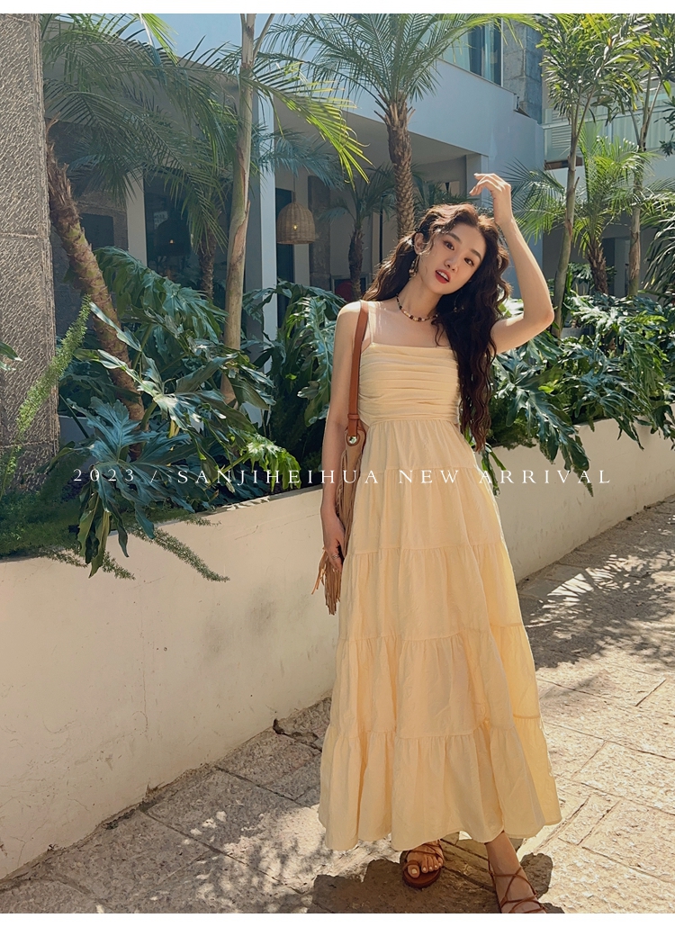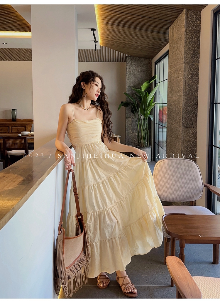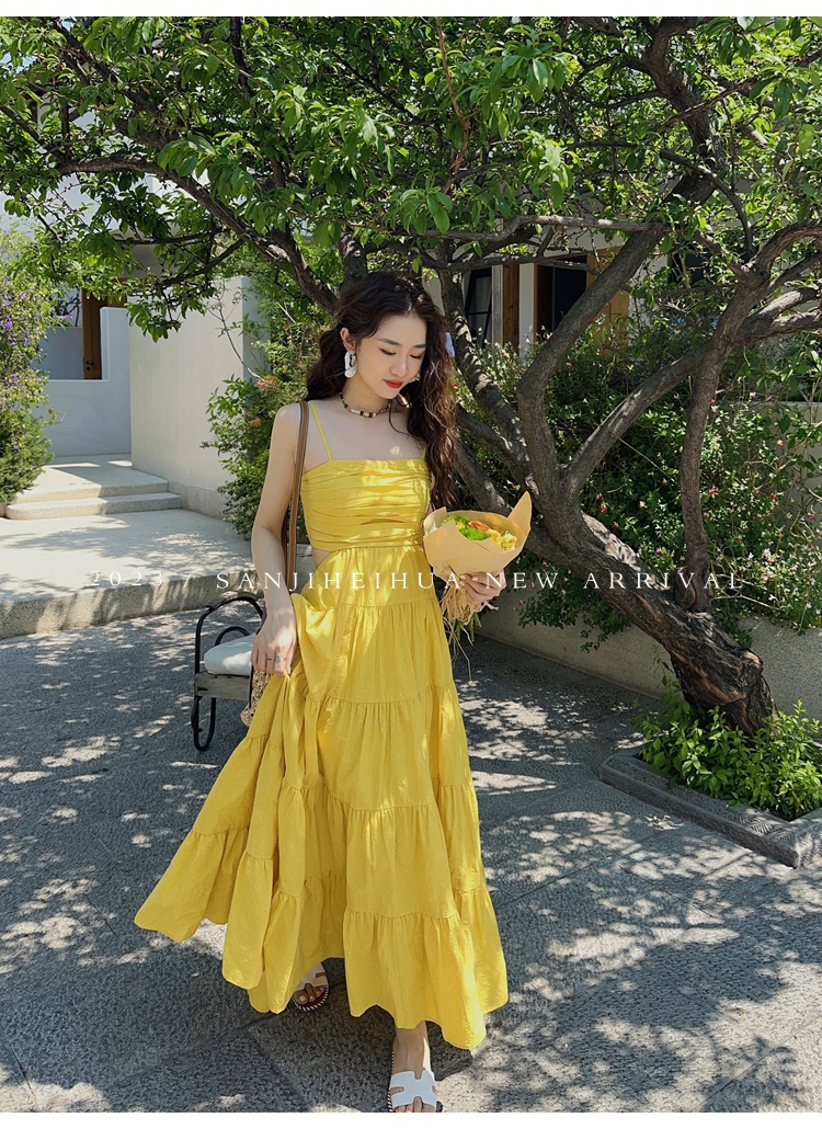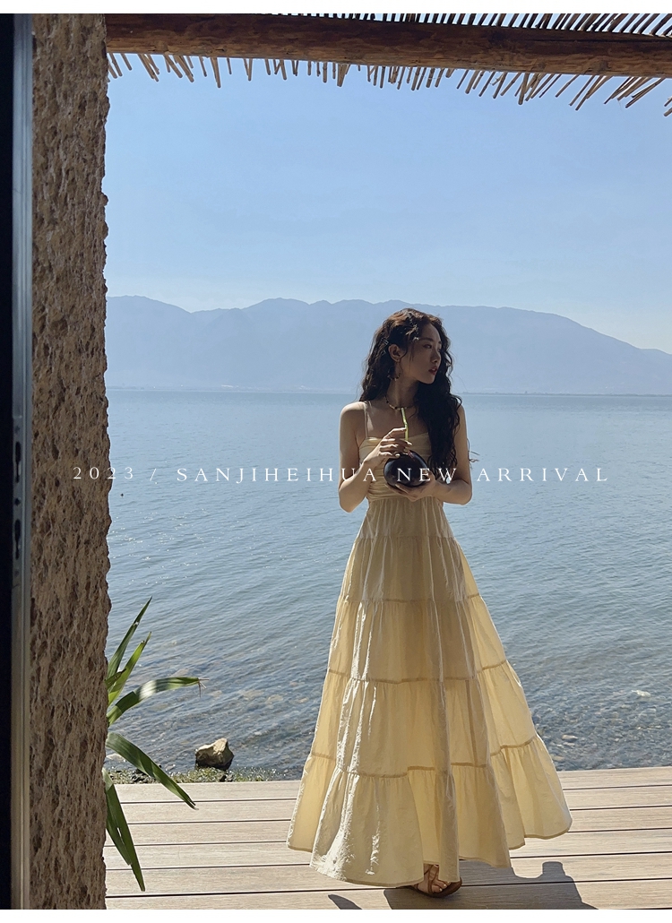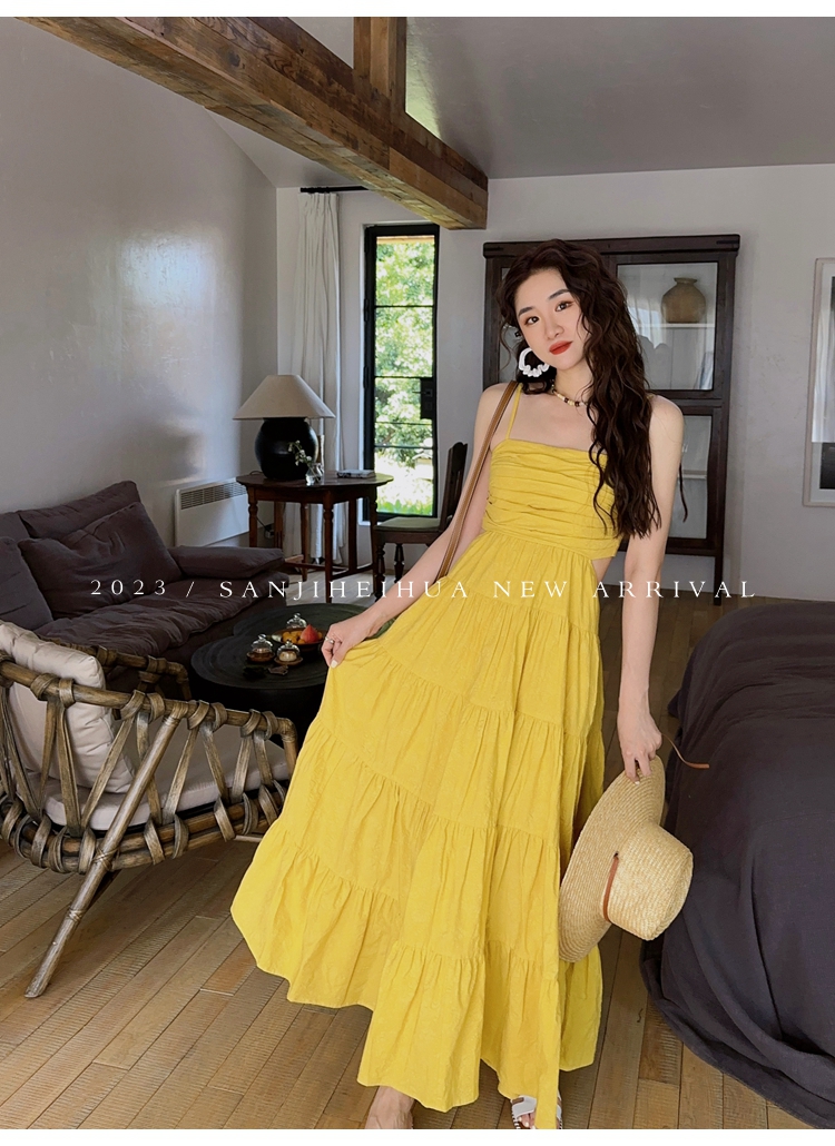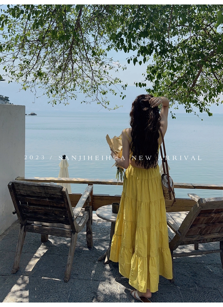 魅影仙女 大擺長裙在逃公主海邊女生v領裙子度假風露背吊帶連衣裙