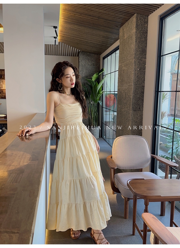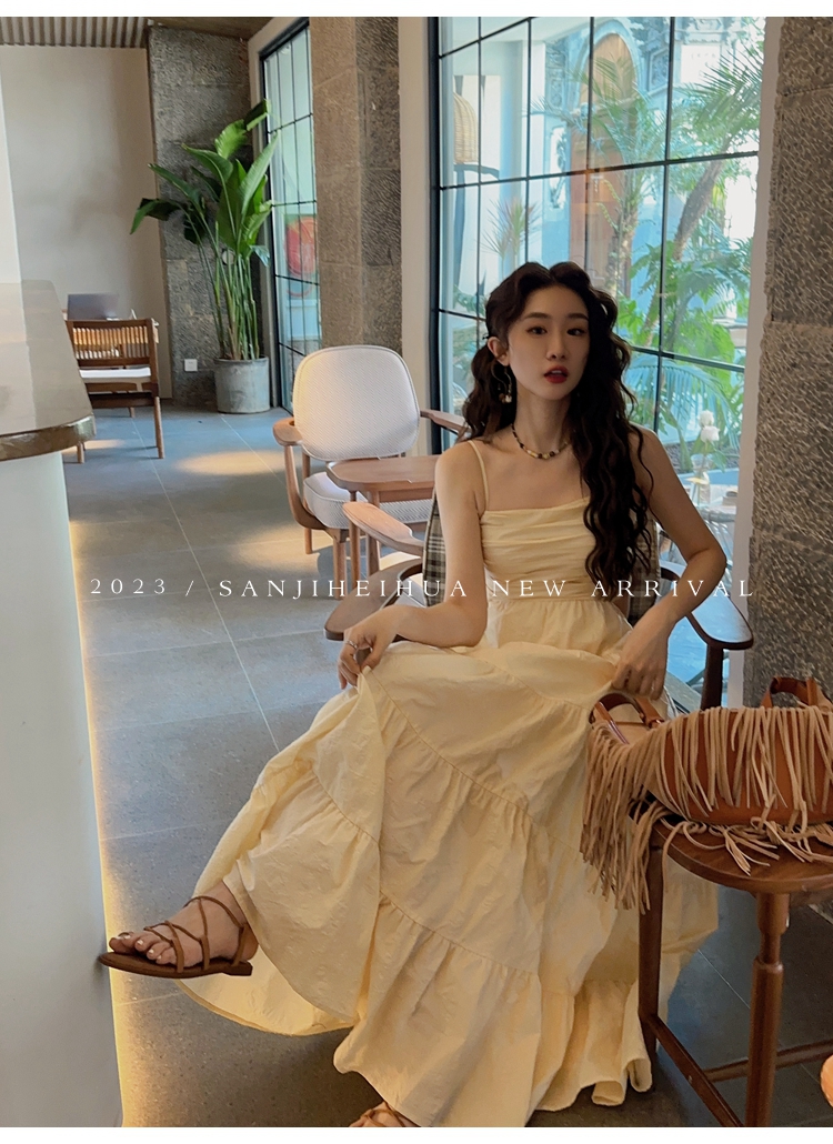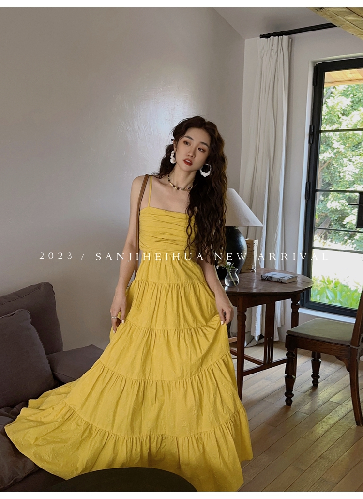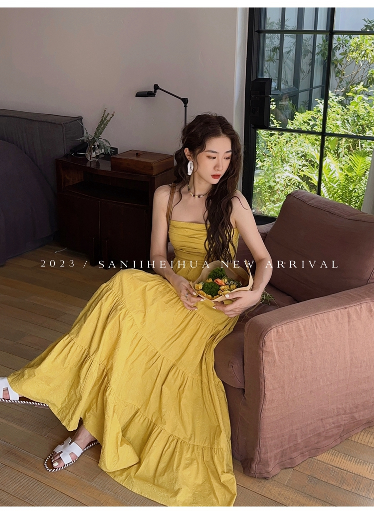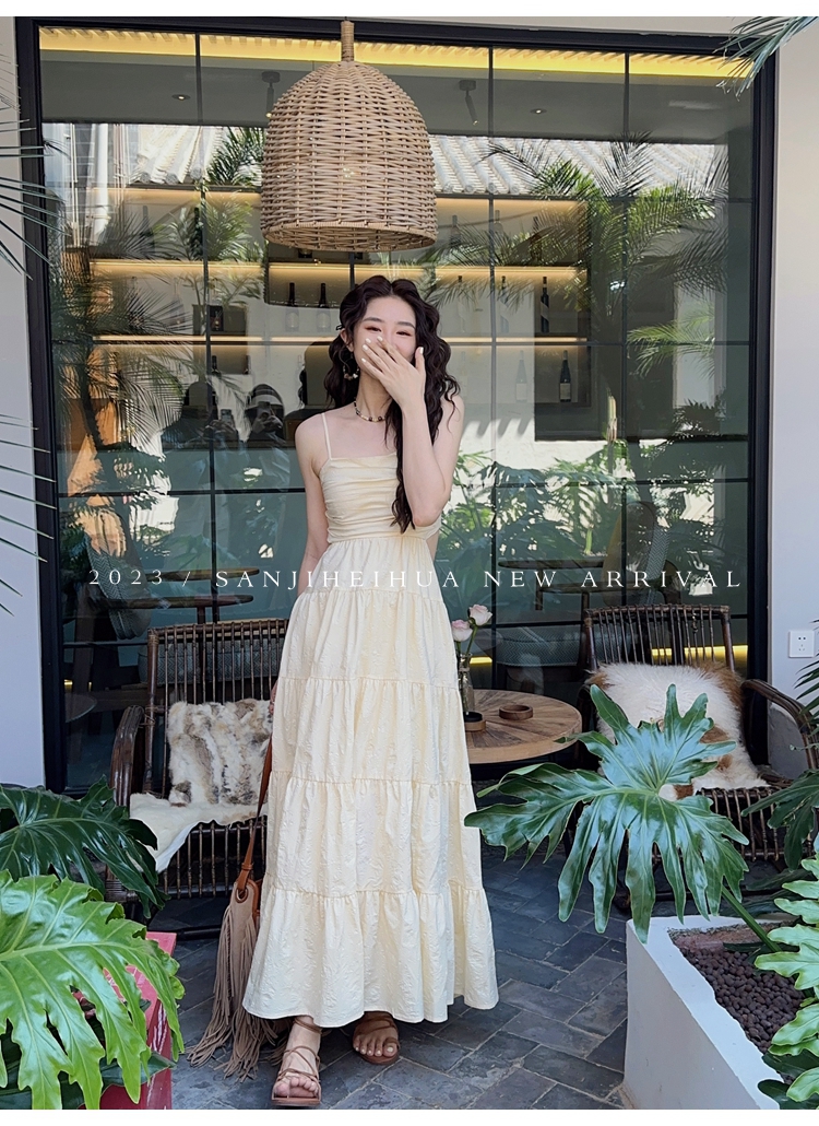 三吉黑花 度假風吊帶連衣裙子女夏季法式長裙2023新氣質出游穿搭