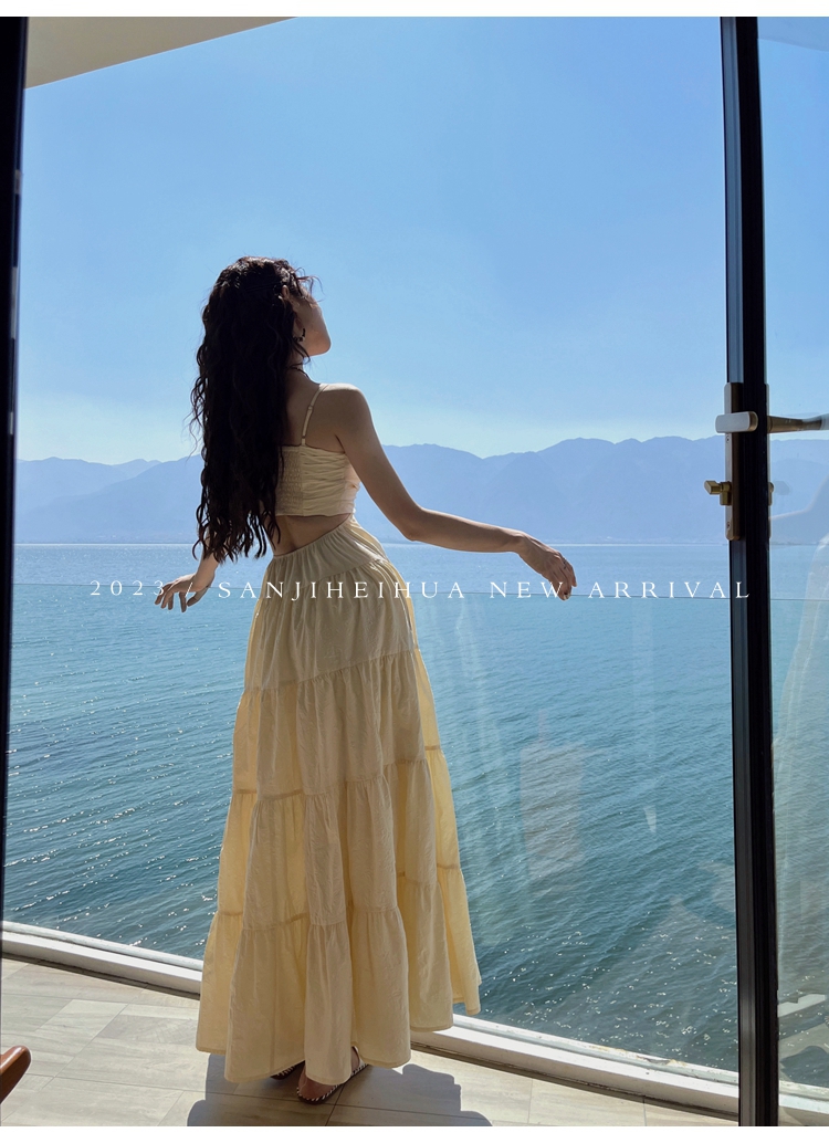 ACHI大也池白色吊帶露腰連衣裙人棉長款裙子純欲a字海邊度假長裙