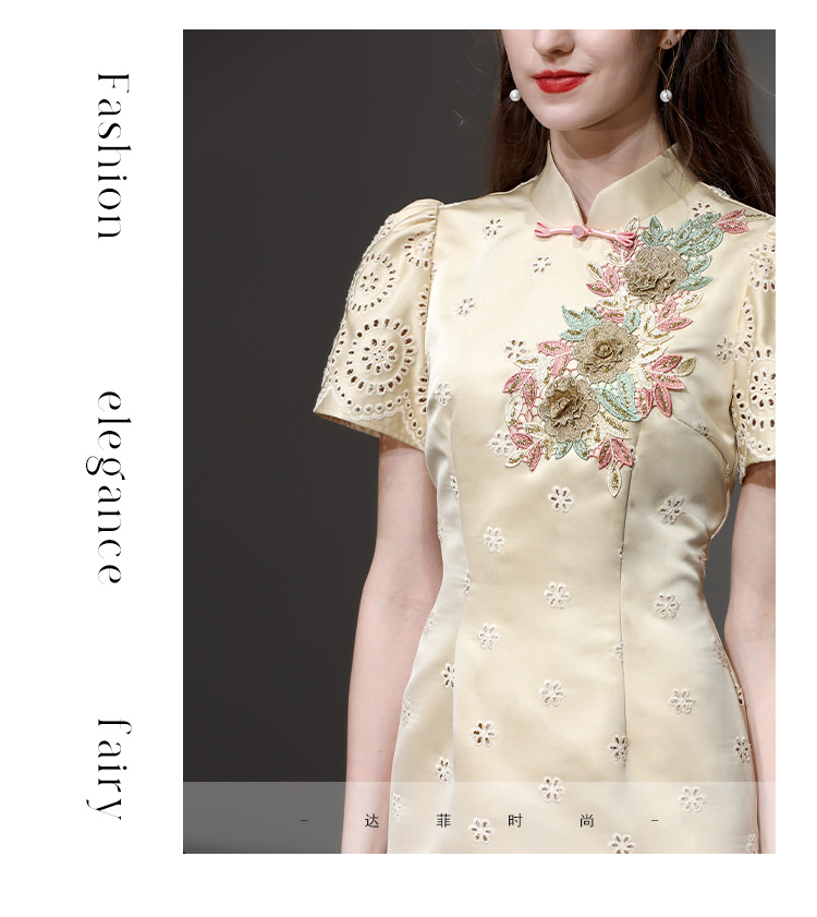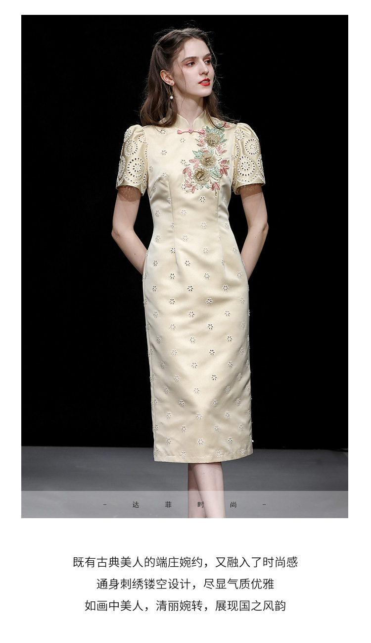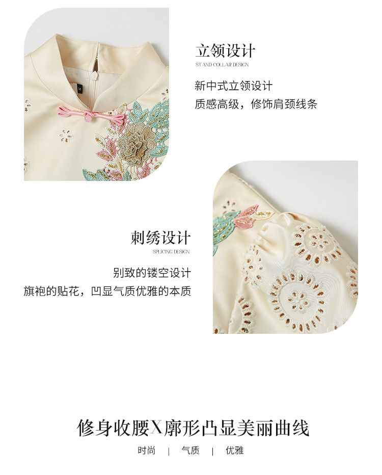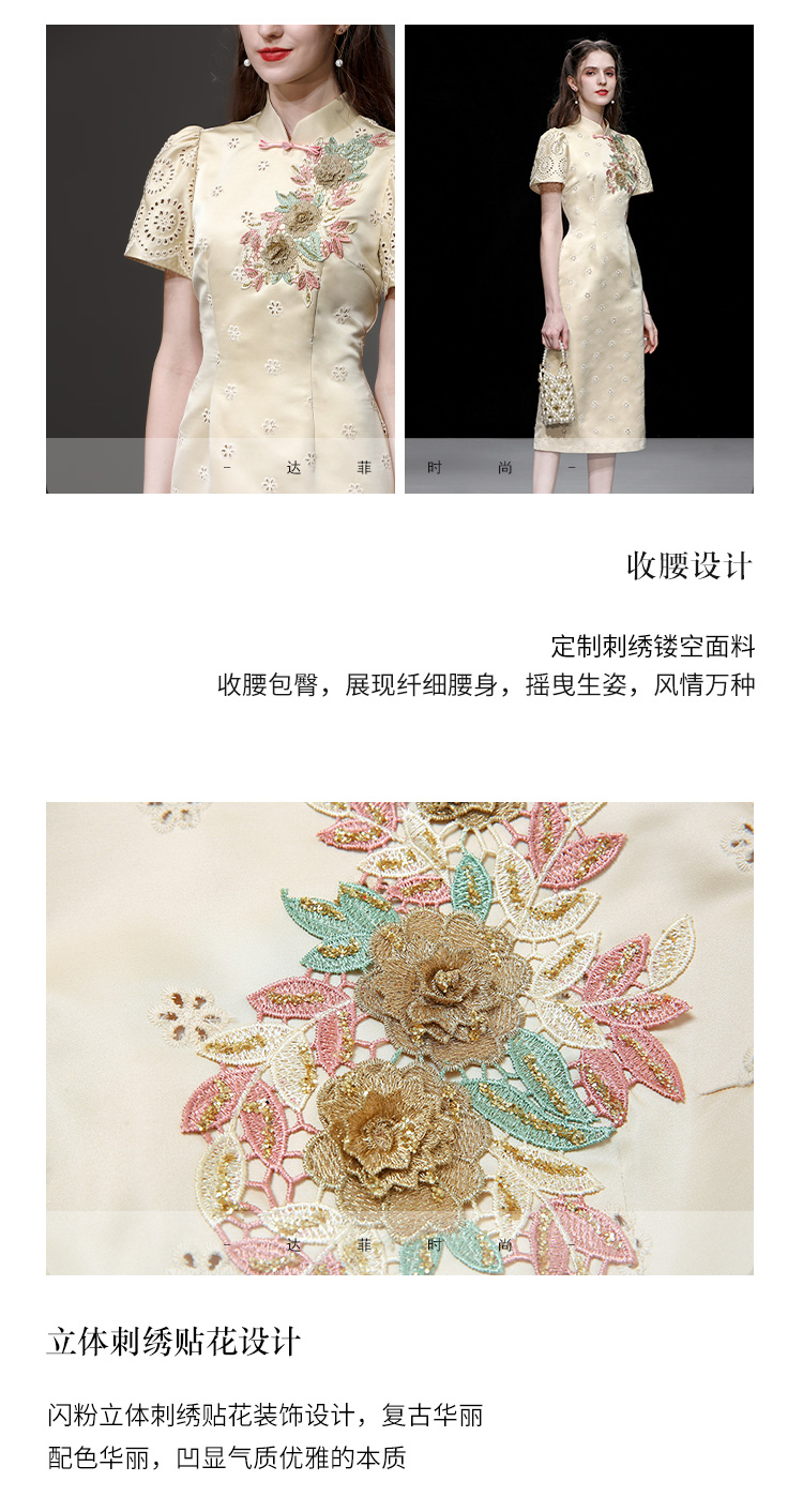 夏季女裝2023新款氣質香檳色修身收腰顯瘦繡花旗袍連衣裙長裙裙子
