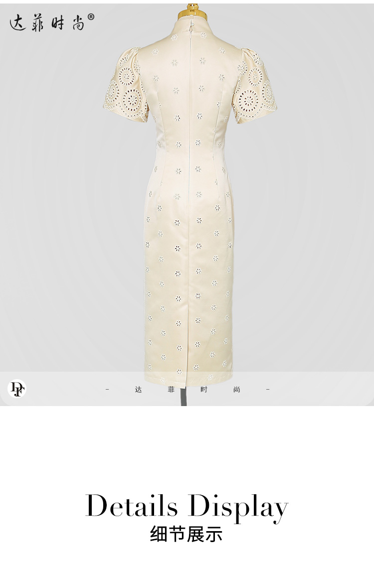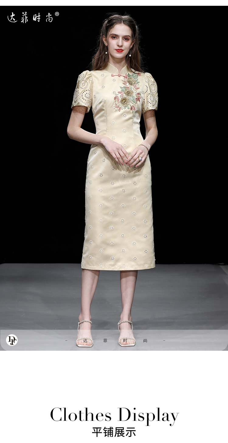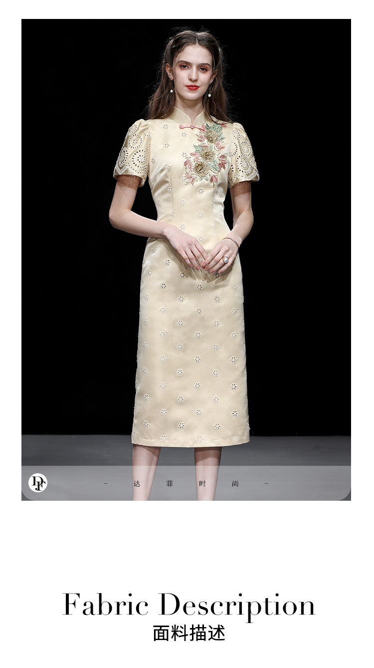 夏季女裝2023新款氣質香檳色修身收腰顯瘦繡花旗袍連衣裙長裙裙子