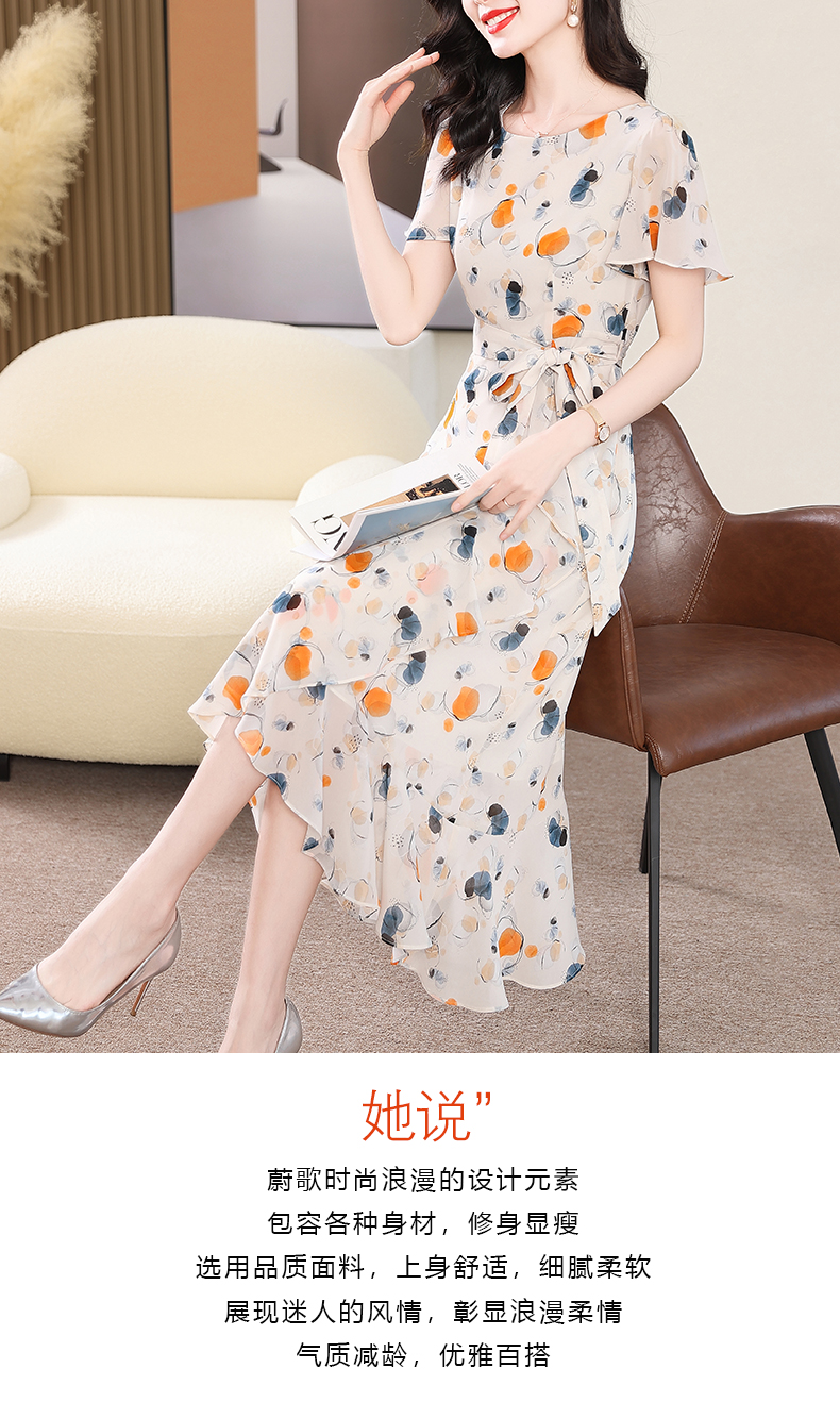 黃色印花荷葉邊連衣裙2023夏季新款氣質修身中長款不規則大擺裙子