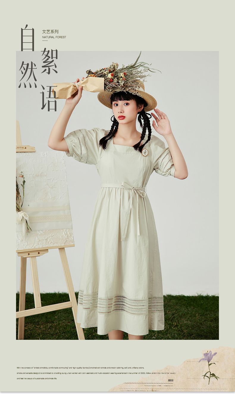 紫涵方領收腰連衣裙法式文藝中長裙2023夏季新款簡約通勤百搭裙子