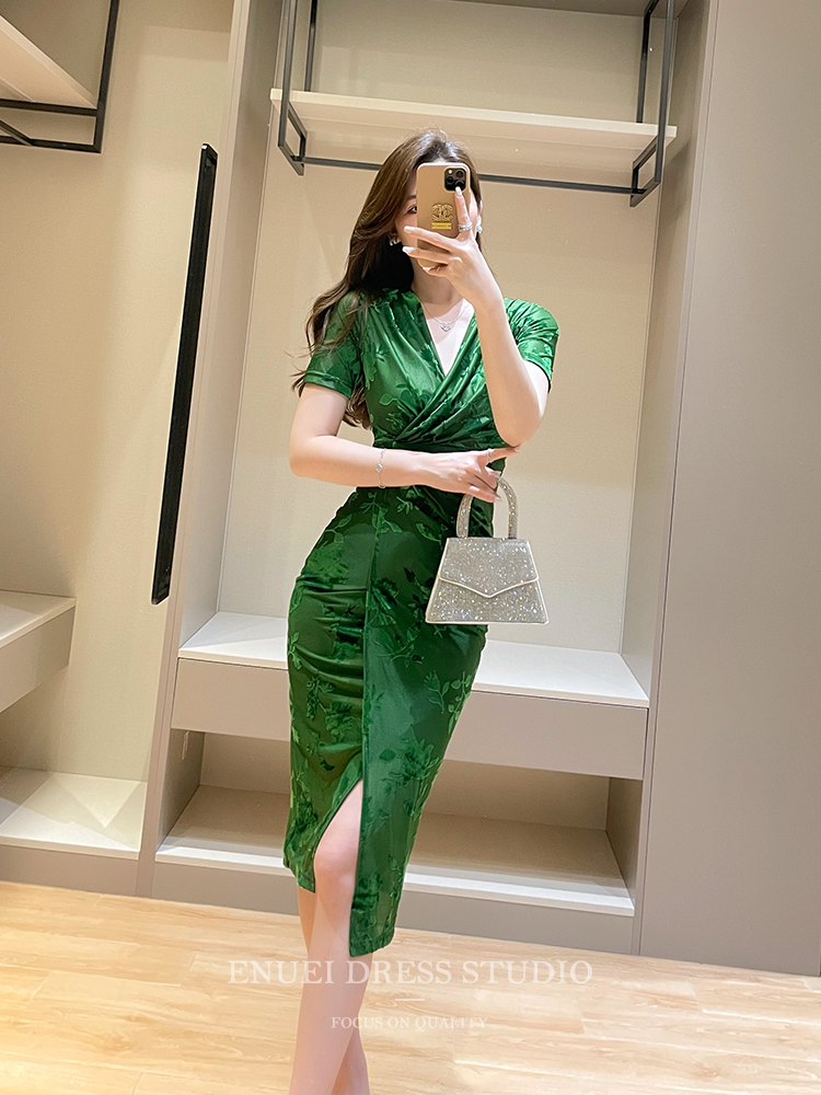 綠色玫瑰印花連衣裙秋裝新款高端彈力網紗V領收腰顯瘦包臀一步裙