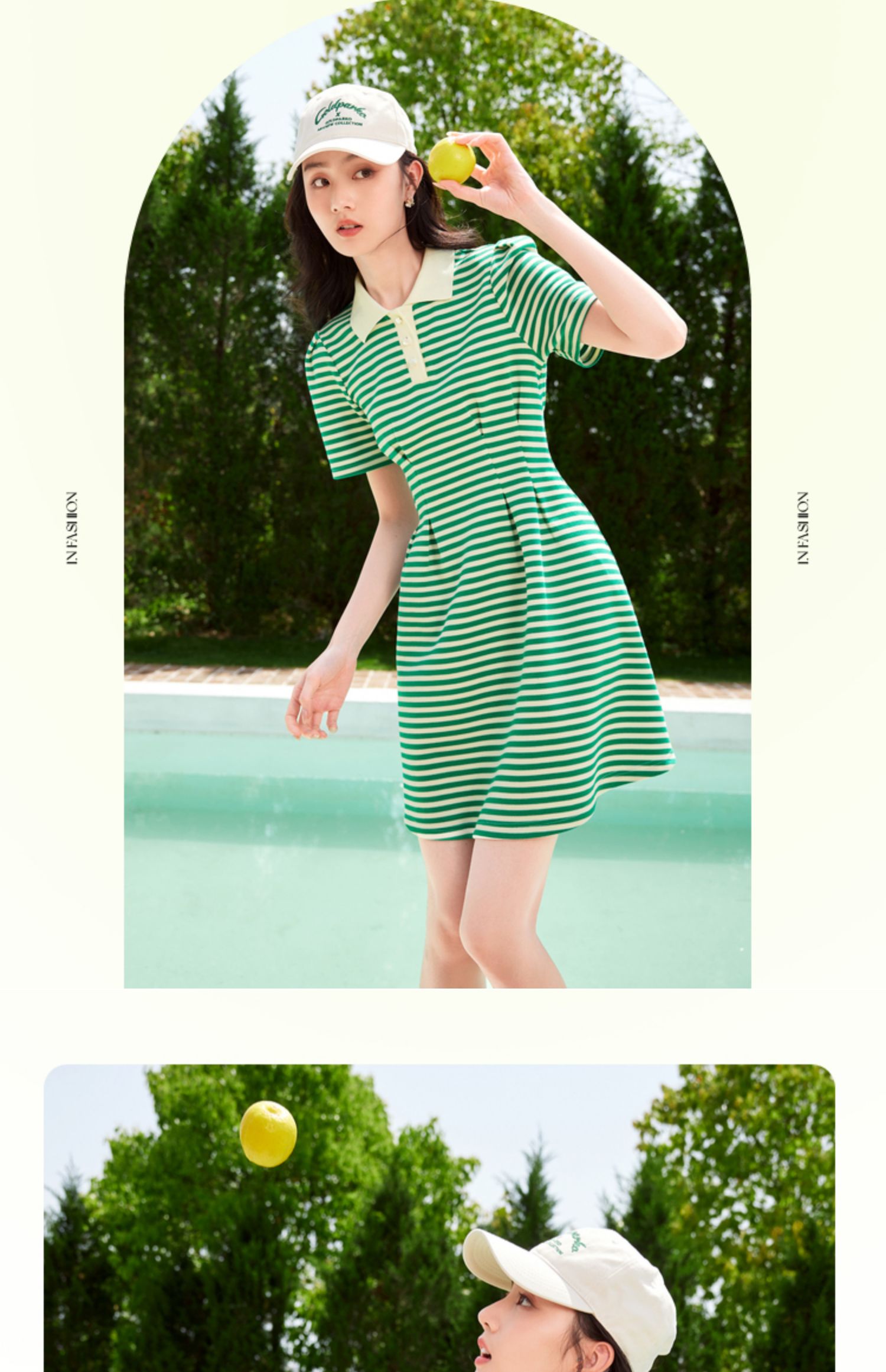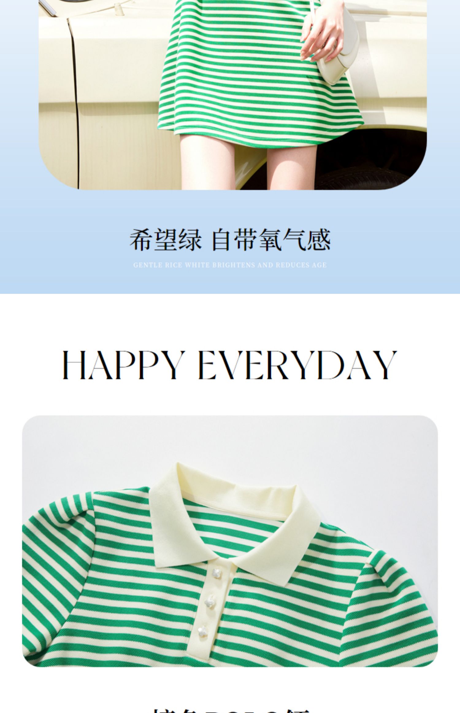 香影polo條紋連衣裙女2023新款休閑收腰顯瘦綠色翻領t恤裙子夏季
