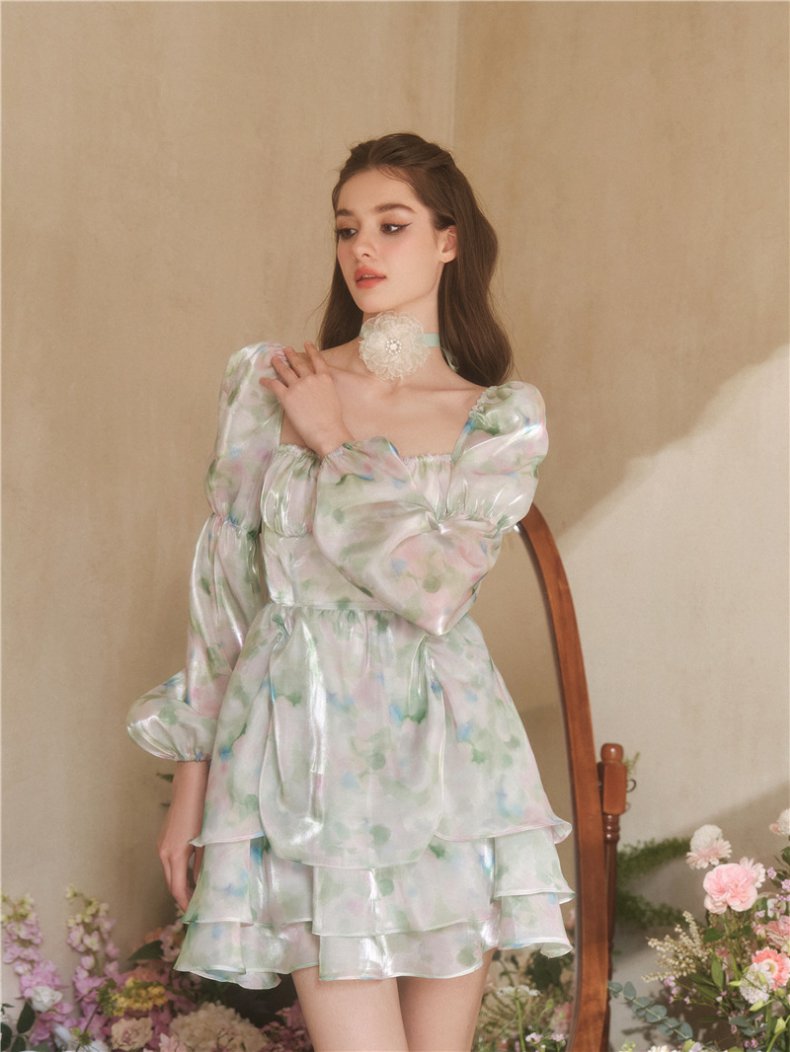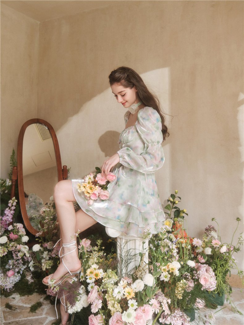 Three Quarters 2023春夏新款 綠色法式公主連衣裙 高級甜美 木蘭