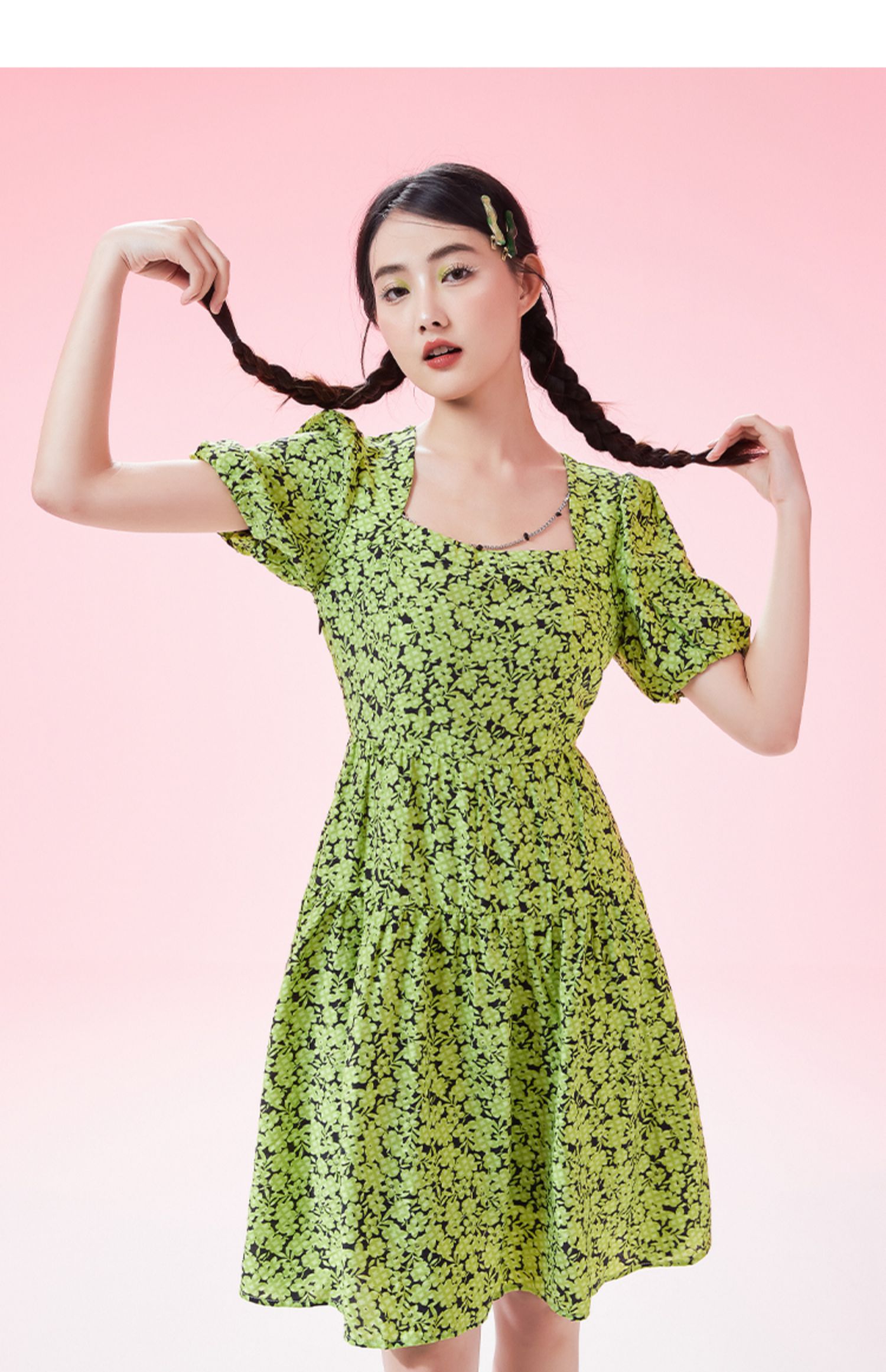 Be about to...夏季新款法式方領收腰顯瘦泡泡袖中長裙碎花連衣裙