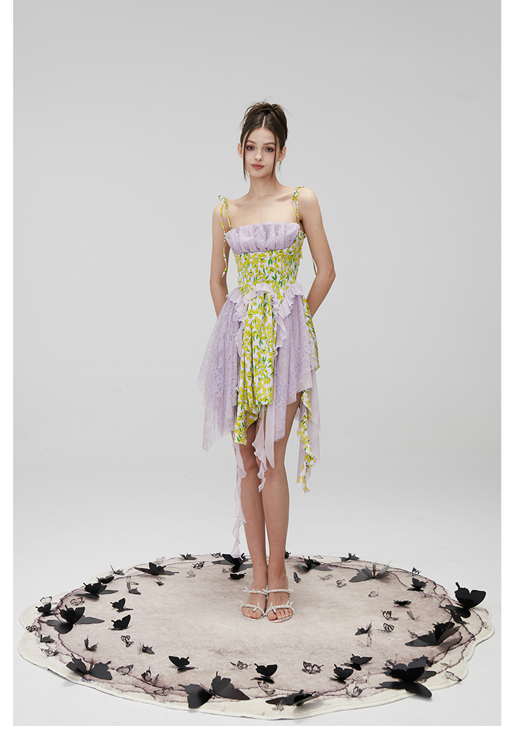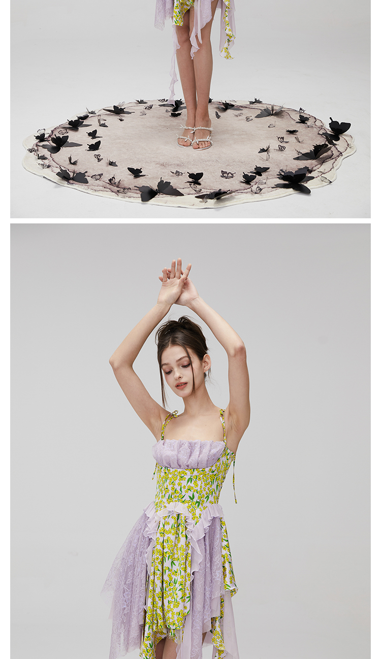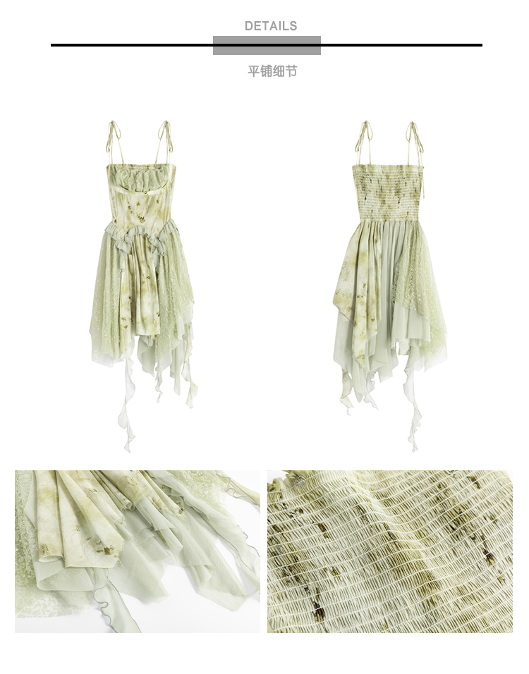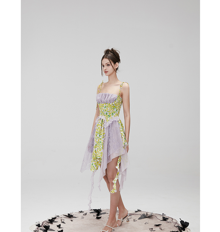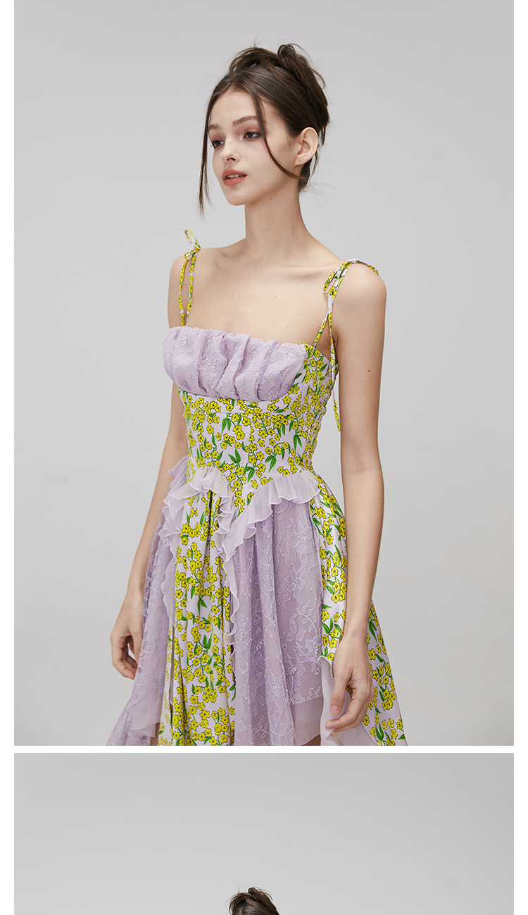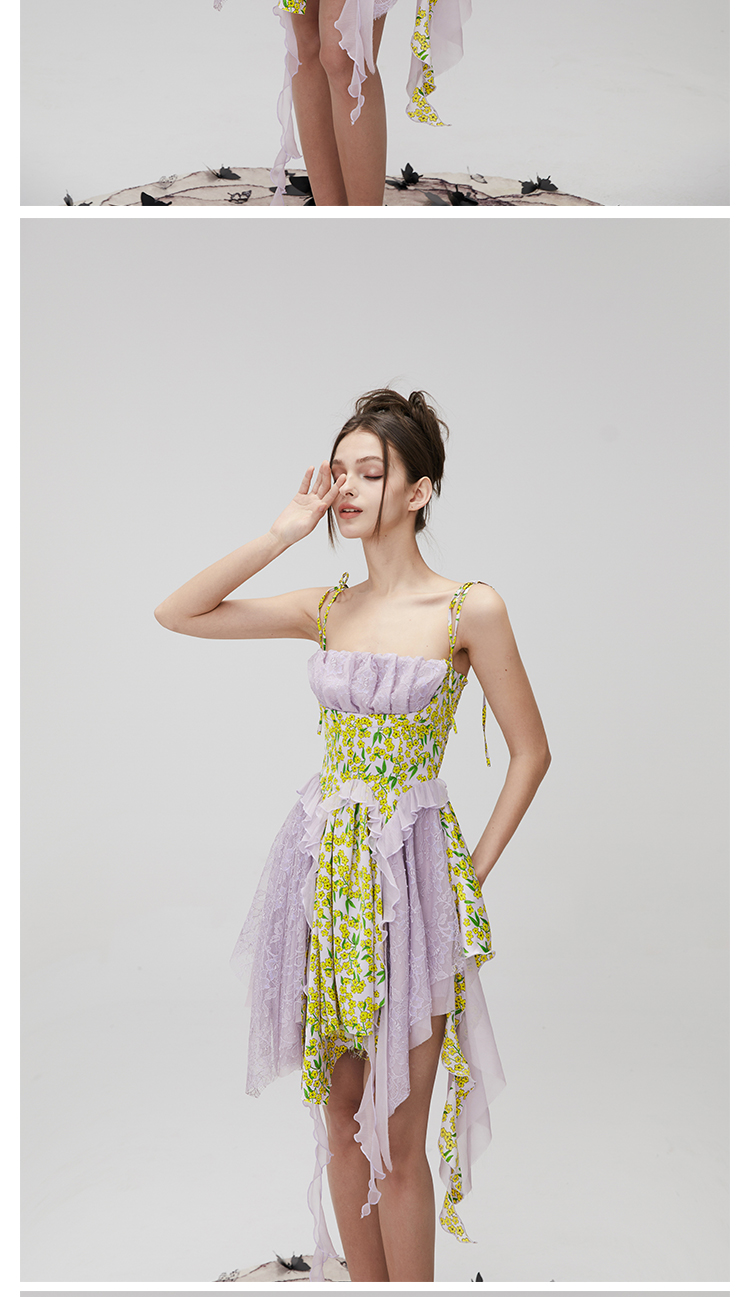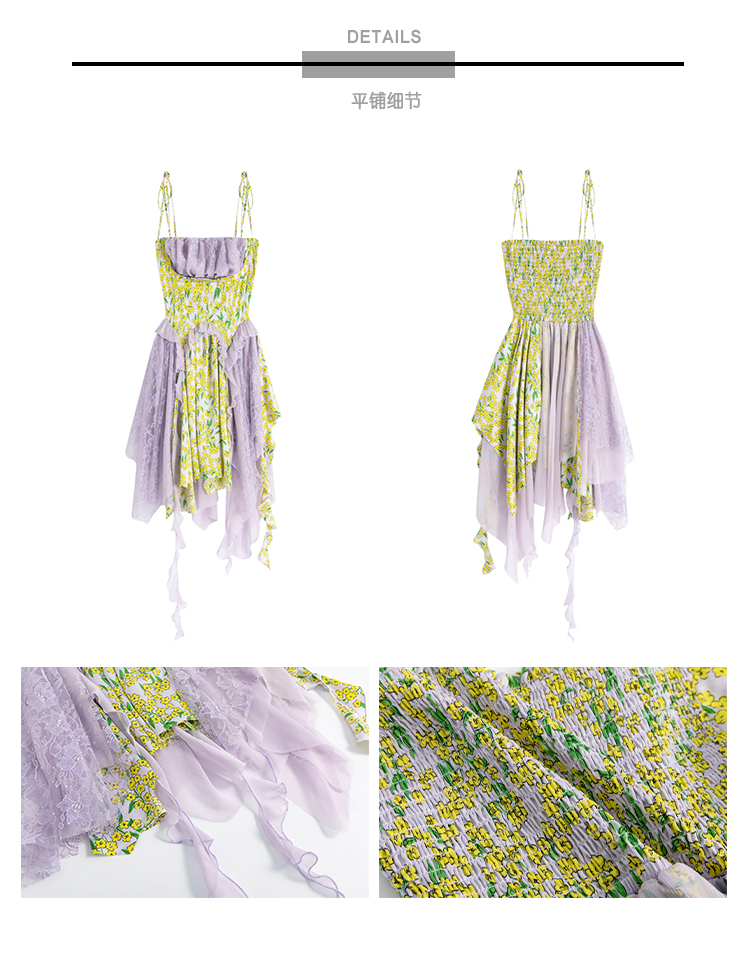 MildRate原創 仙樂飄飄 碎花緞面蕾絲真絲皺拼接不規則吊帶連衣裙