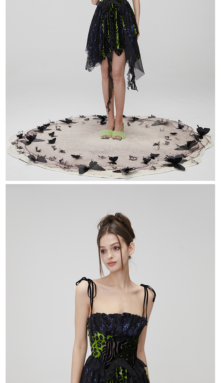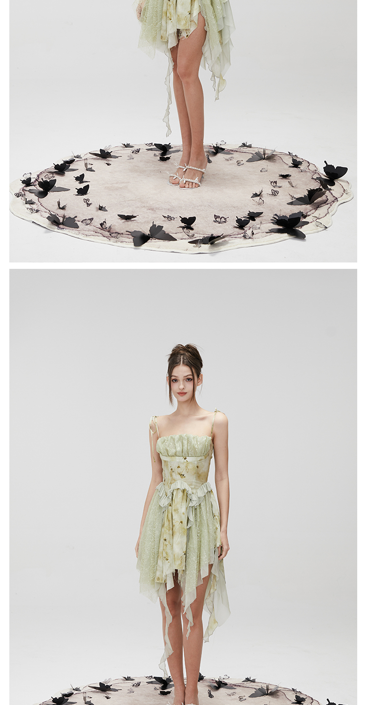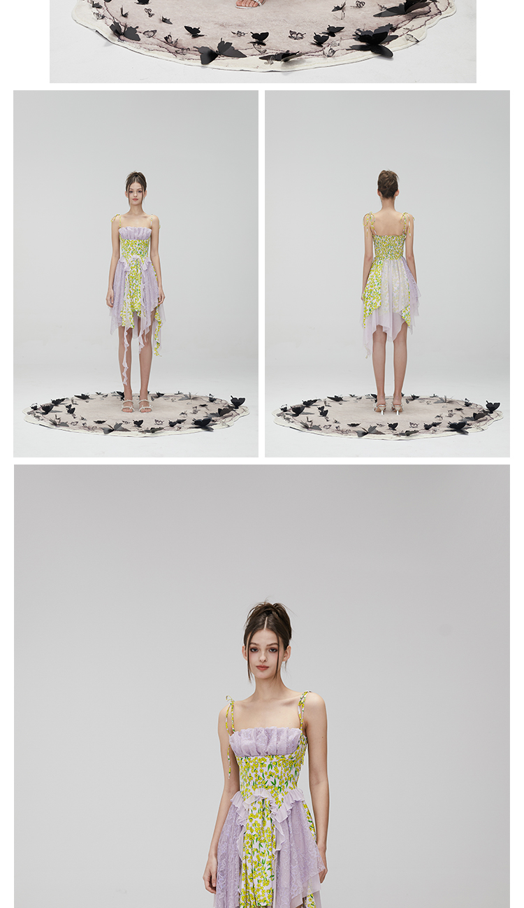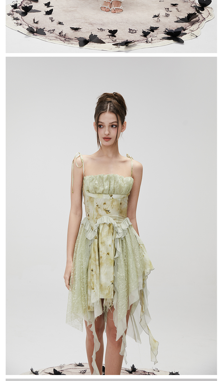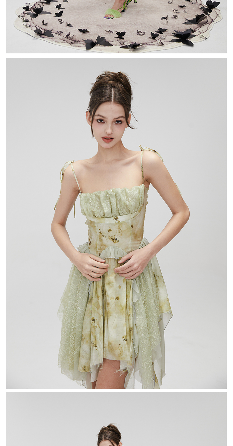 MildRate原創 仙樂飄飄 碎花緞面蕾絲真絲皺拼接不規則吊帶連衣裙