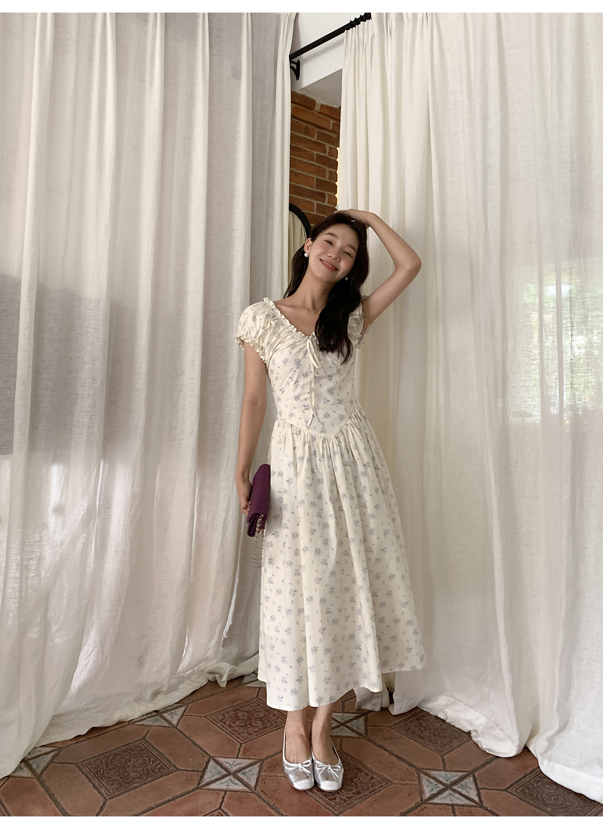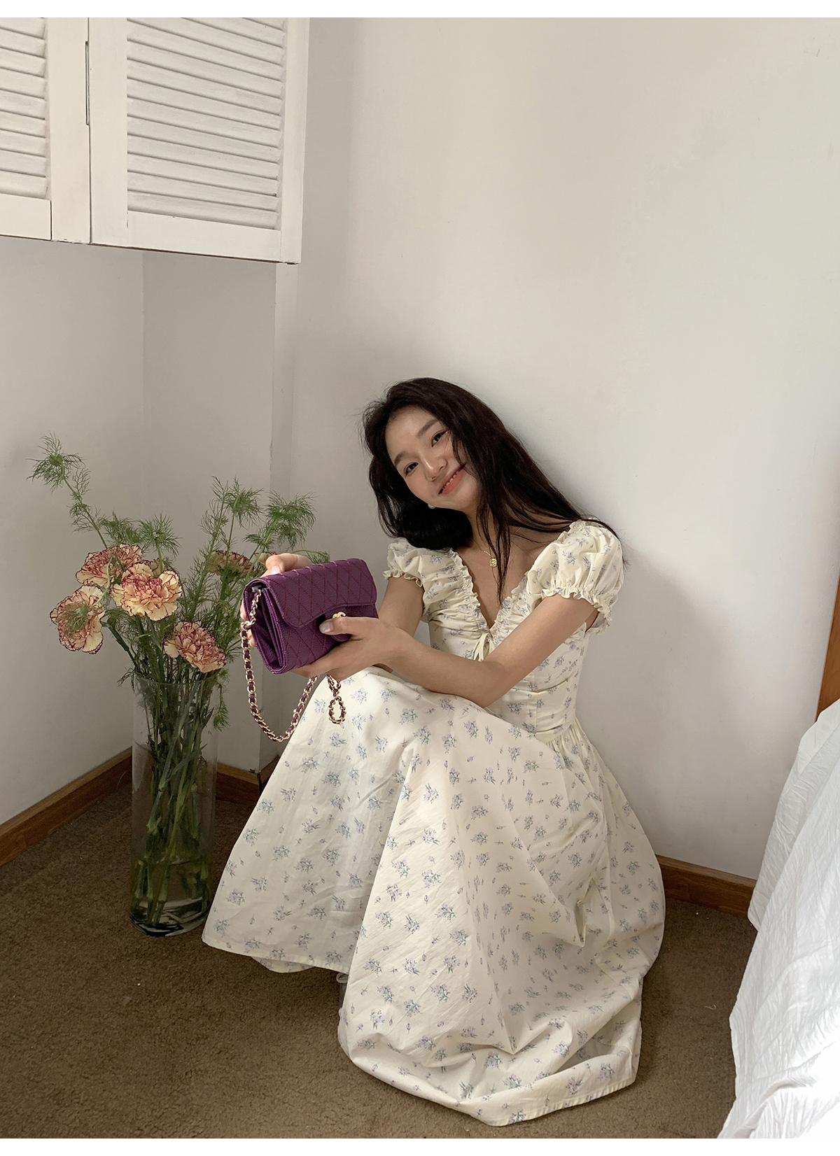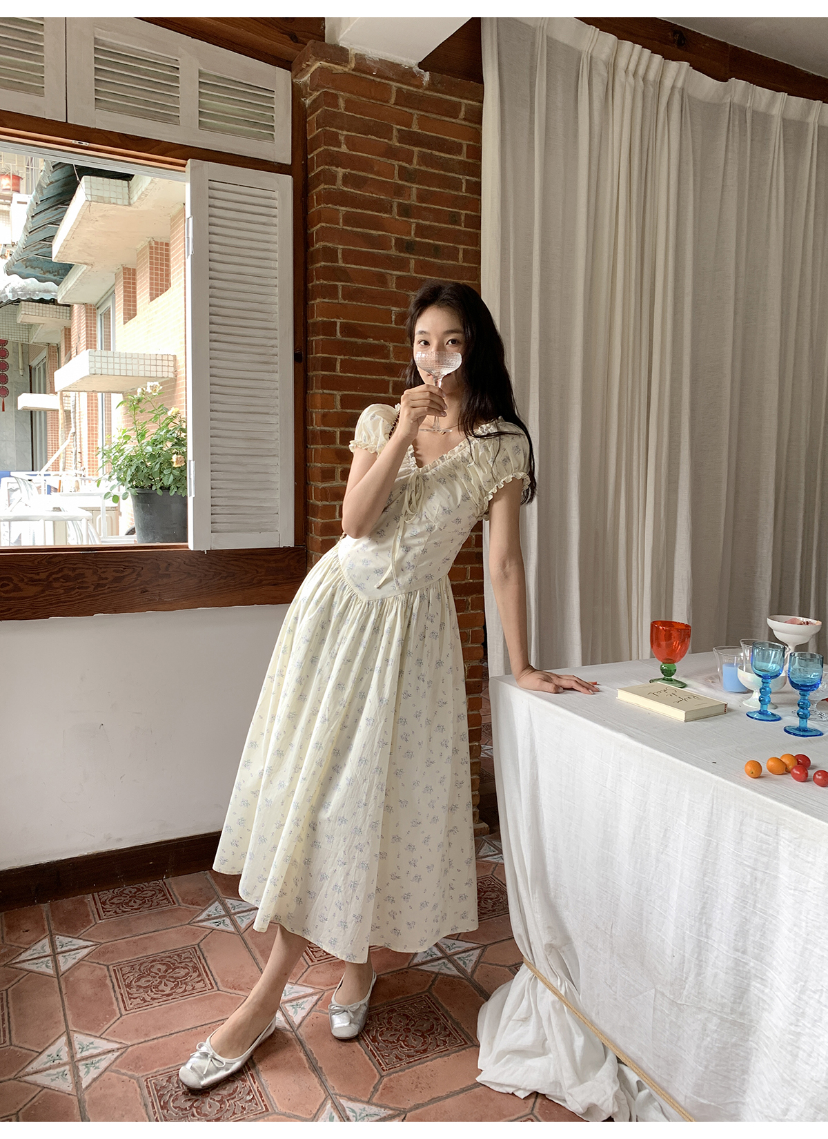 XXNING 純欲甜美氣質一字肩碎花連衣裙女云朵袖小眾別致抽褶長裙