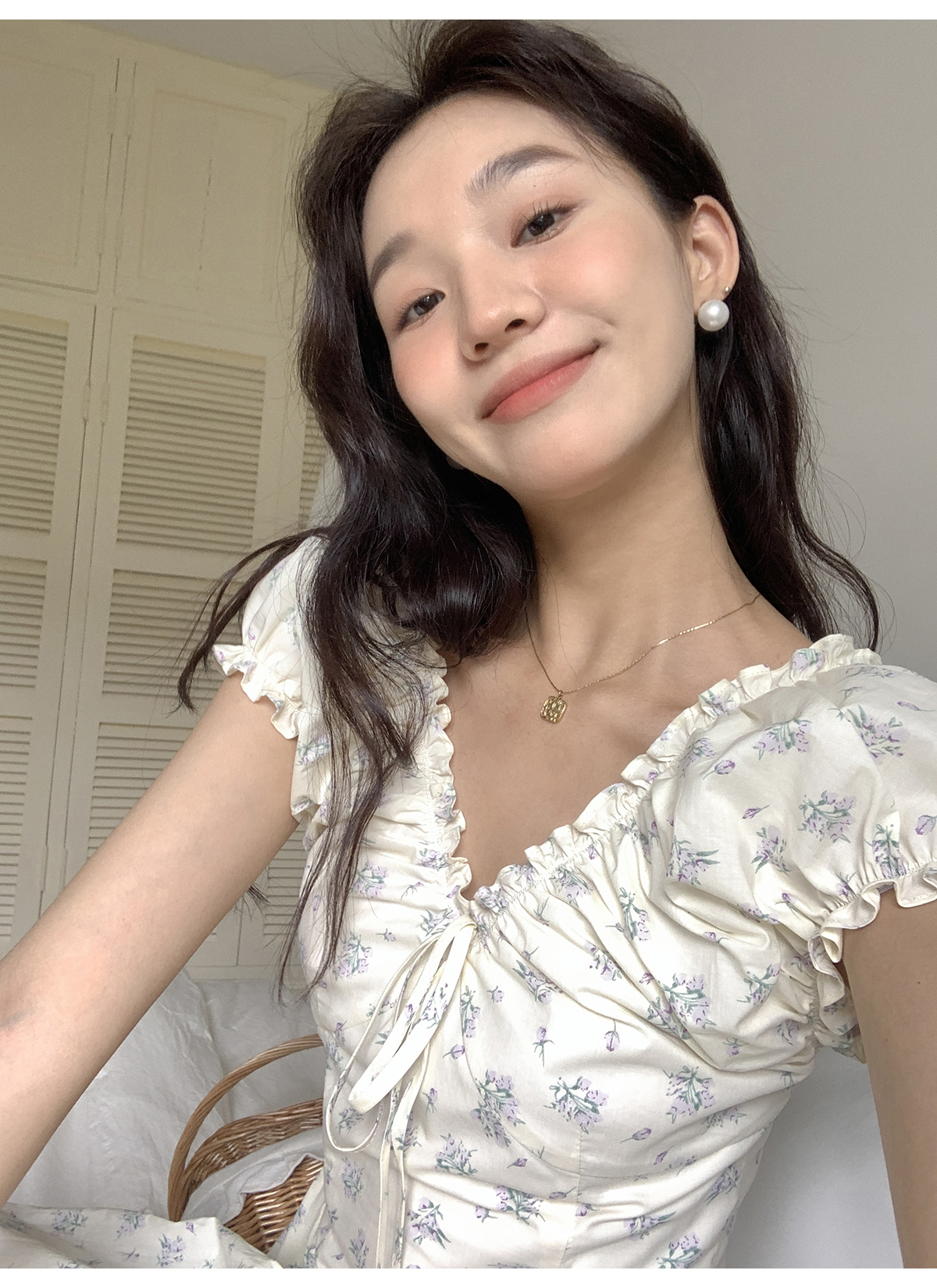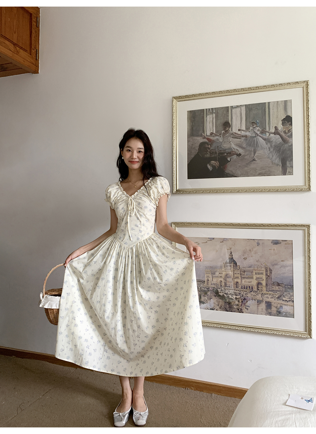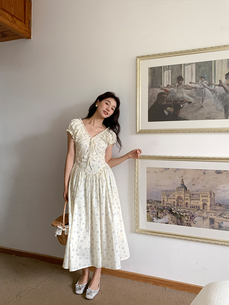 XXNING 純欲甜美氣質一字肩碎花連衣裙女云朵袖小眾別致抽褶長裙