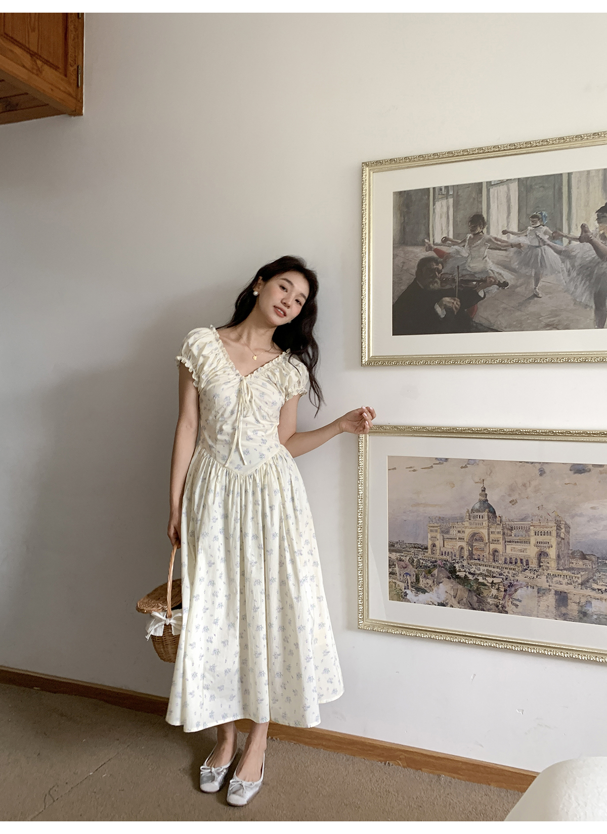 2023新款連衣裙別致V領泡泡袖口袋裙茶里茶氣短袖大擺茶歇裙女夏