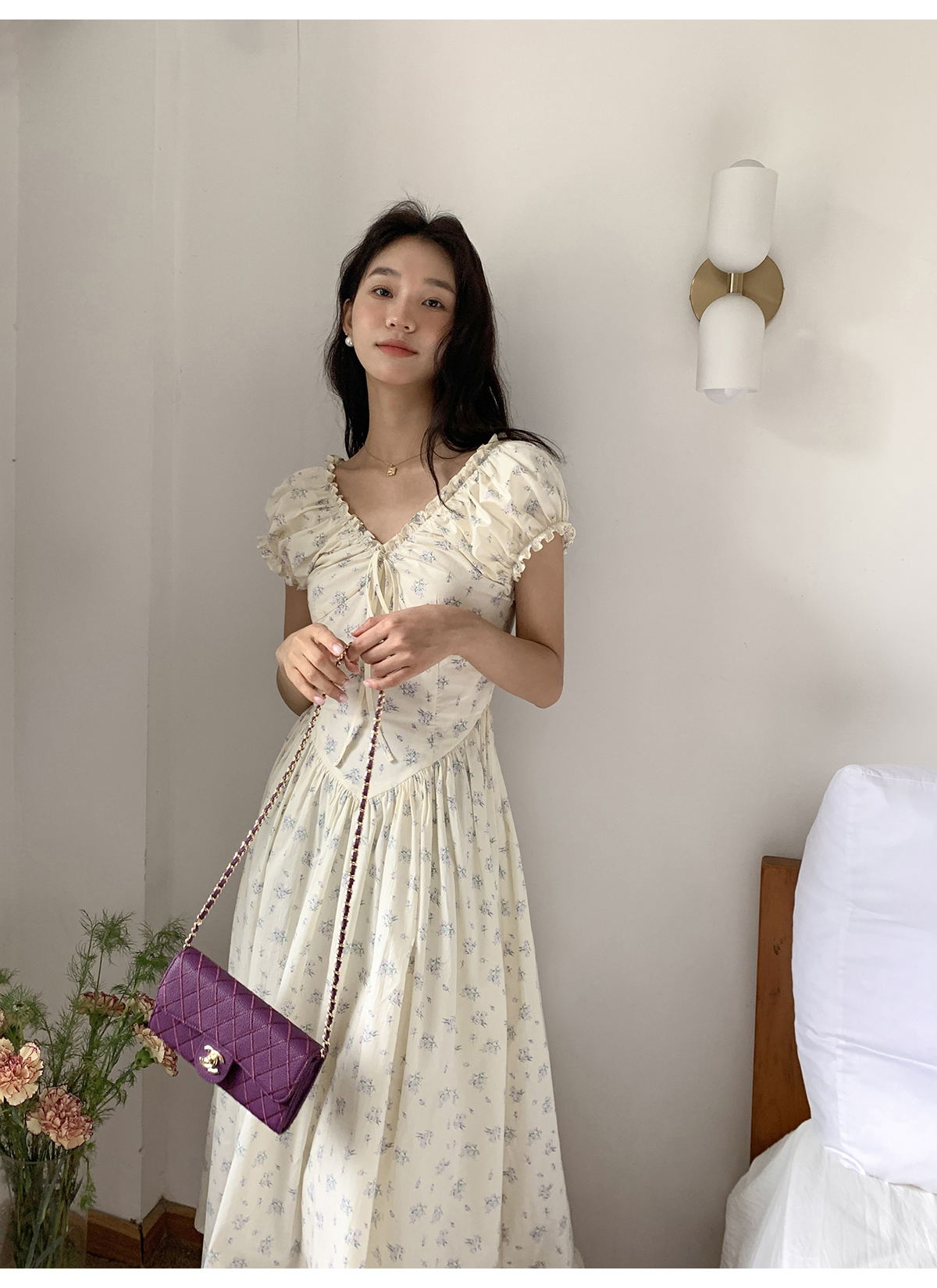 XXNING 法式浪漫褶皺V領碎花連衣裙秋冬長款溫柔氣質小眾長裙