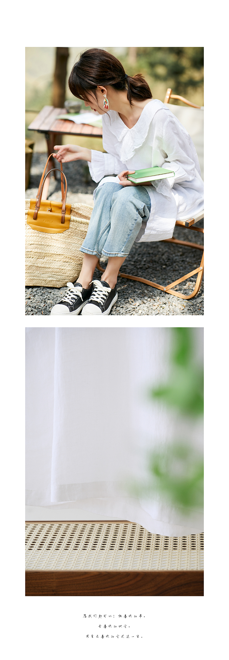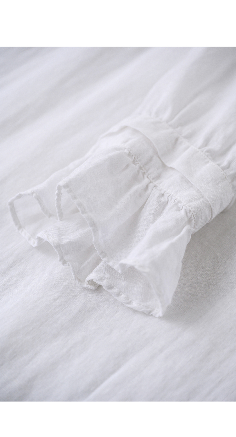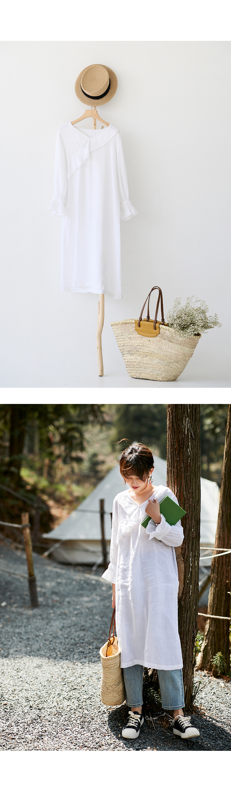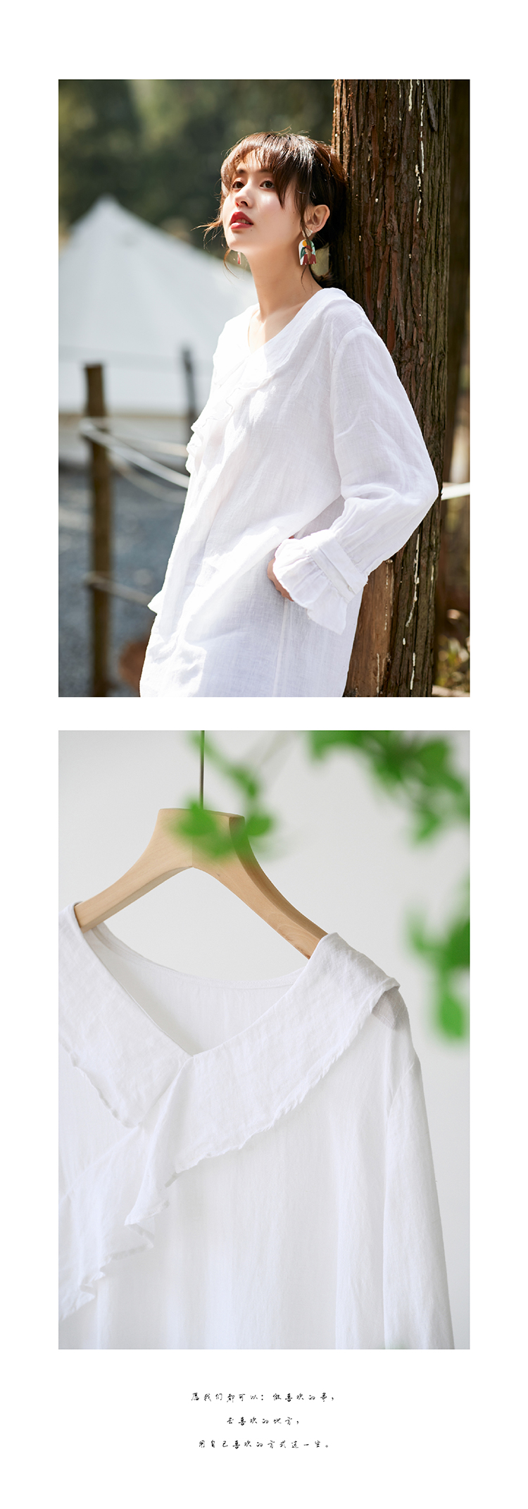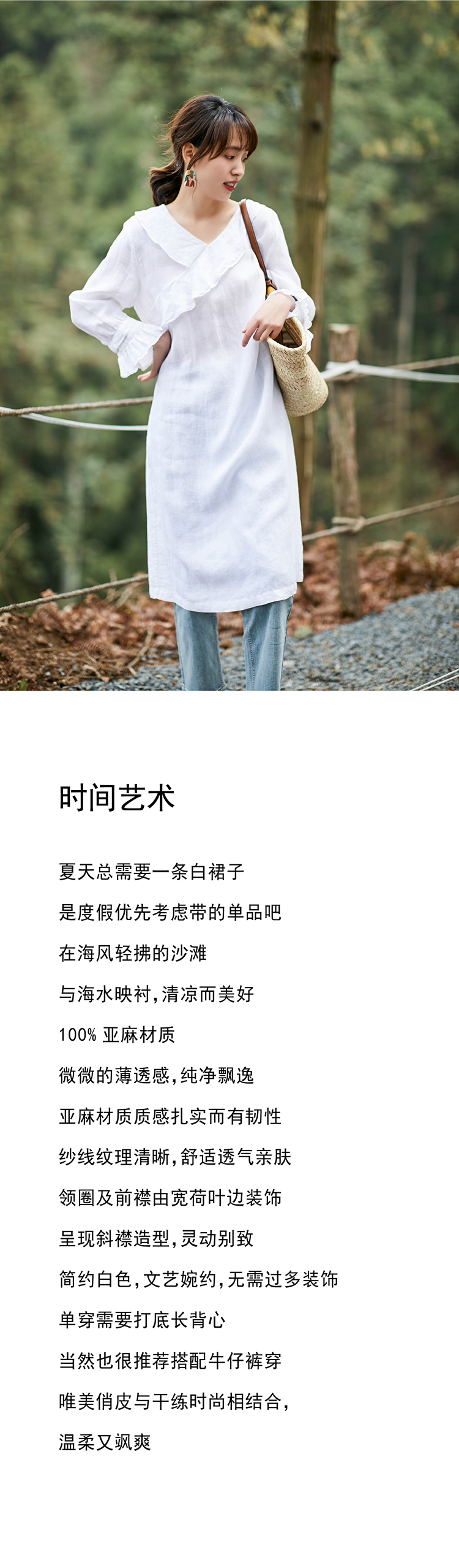 梭家|時間藝術| 簡約文藝純亞麻白色連衣裙夏季女長袖套頭通勤