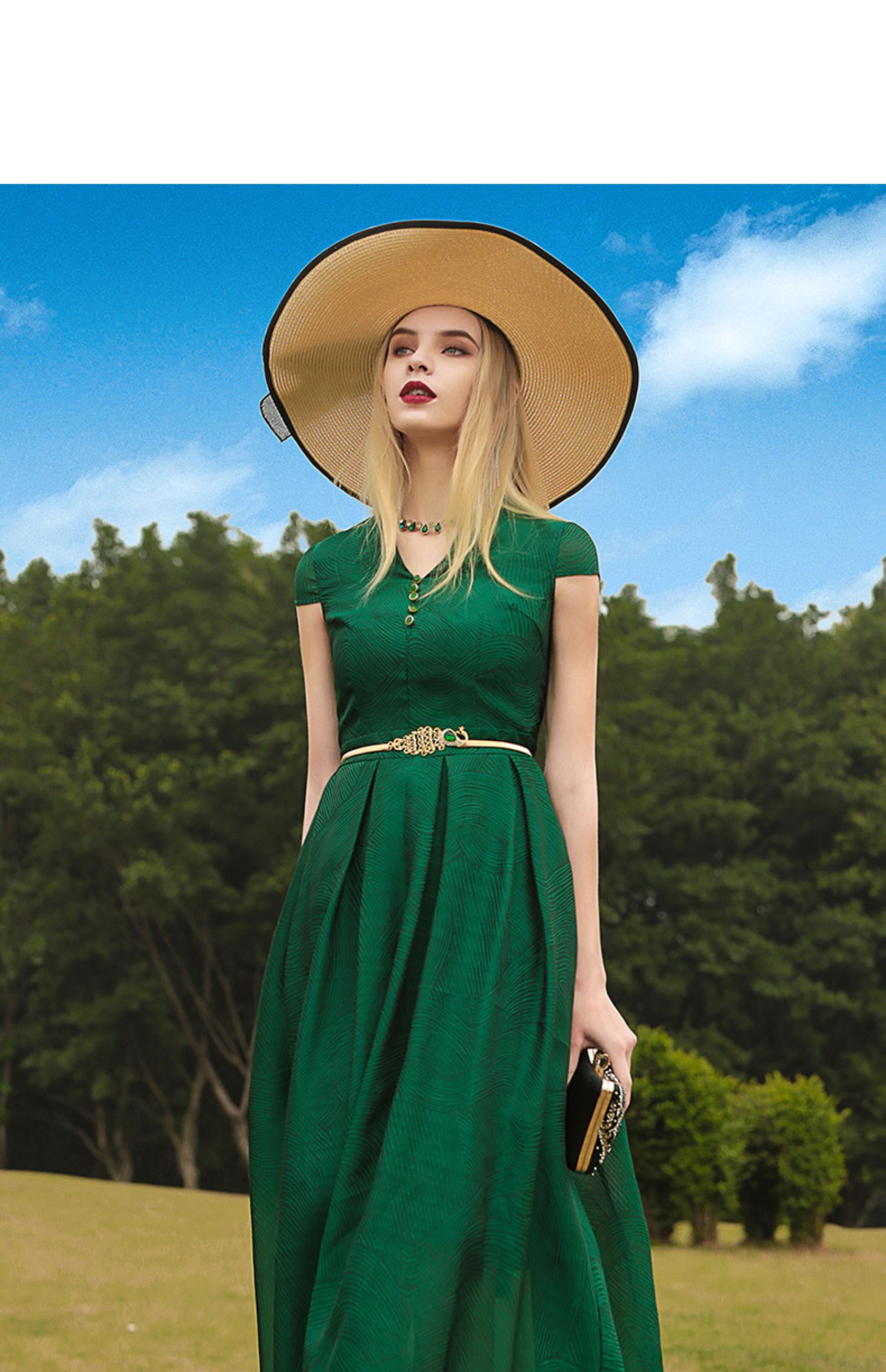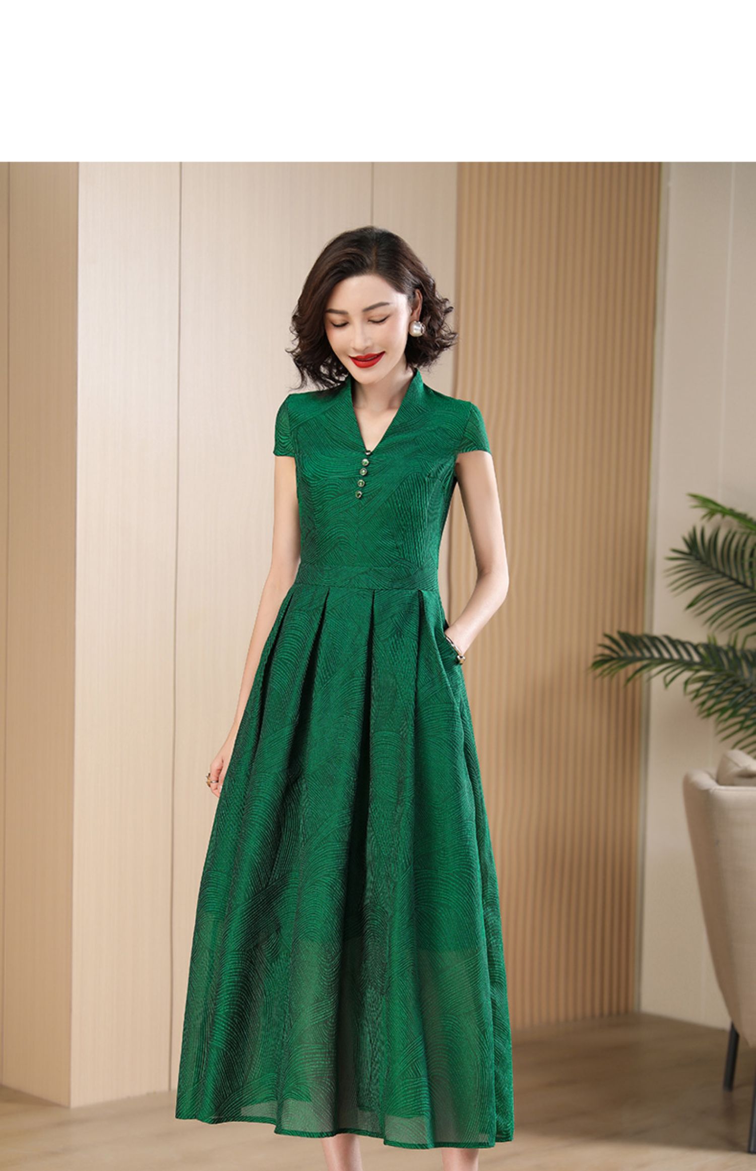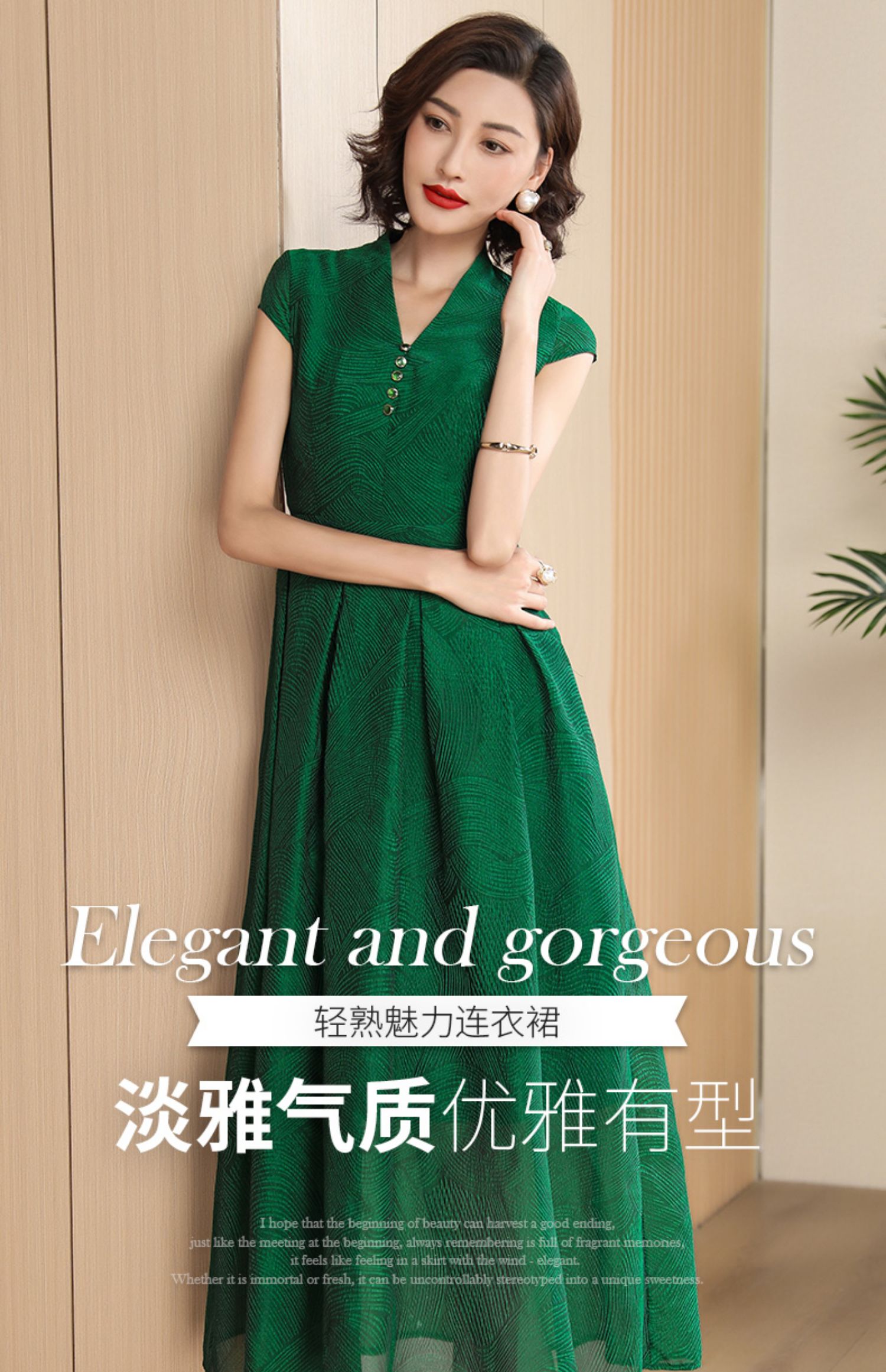 帝弗潤馳2023夏款氣質V領國高端輕奢連衣裙長款收腰綠色質感長裙