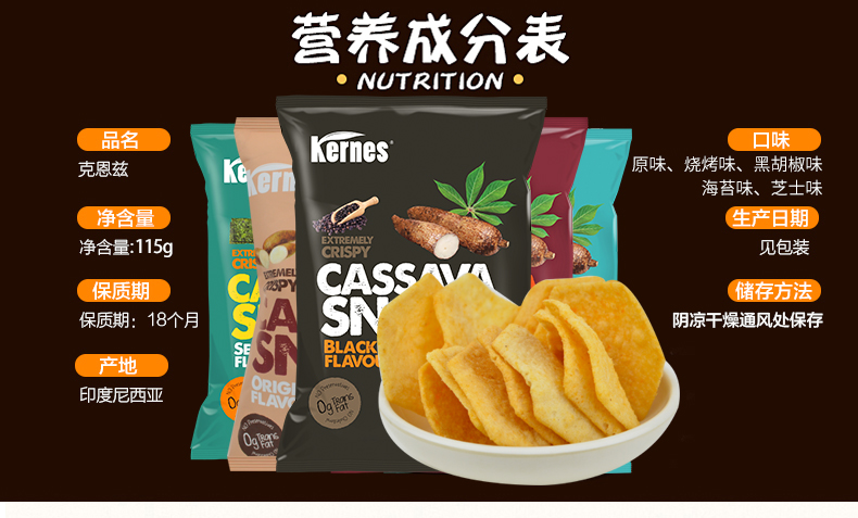 Kernes克恩茲木薯脆片印尼進口原味燒烤味休閑零食薯片115g*3包裝