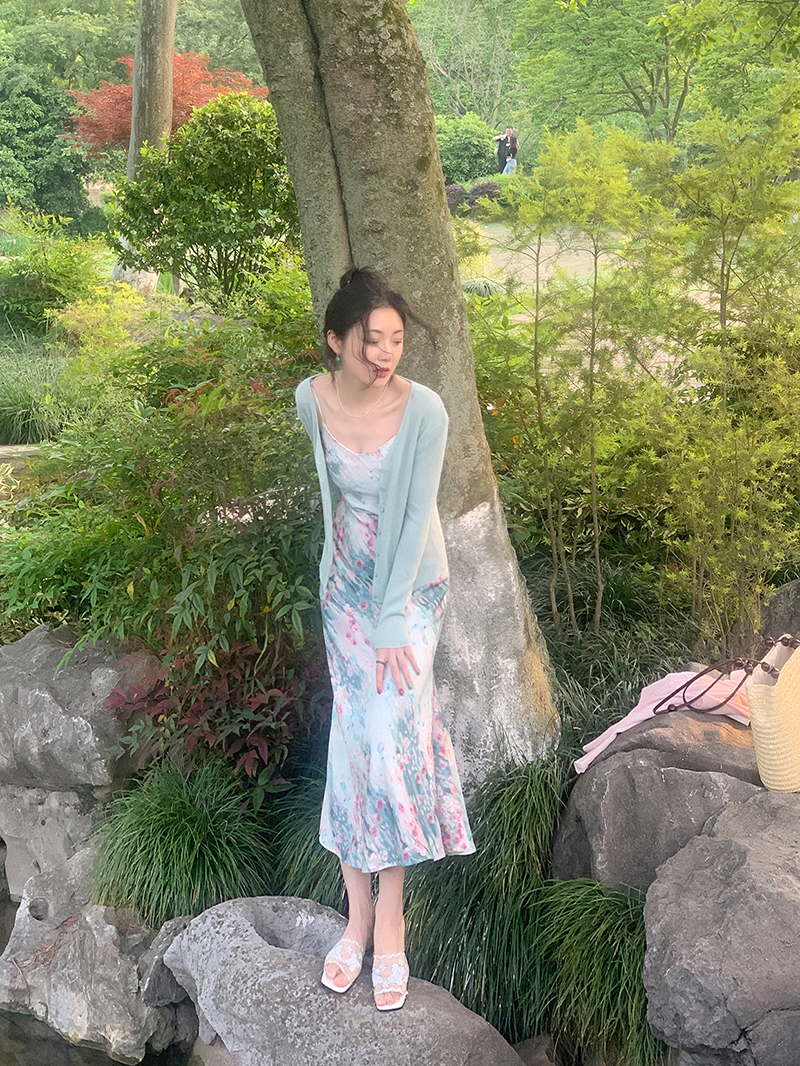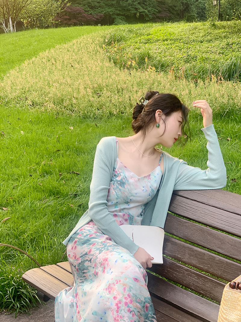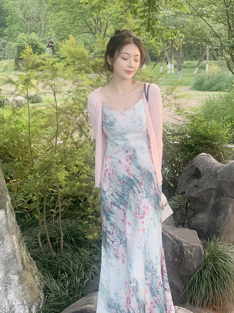 【莫奈花園】法式復古V領油畫印花吊帶連衣裙 修身收腰氣質長裙子