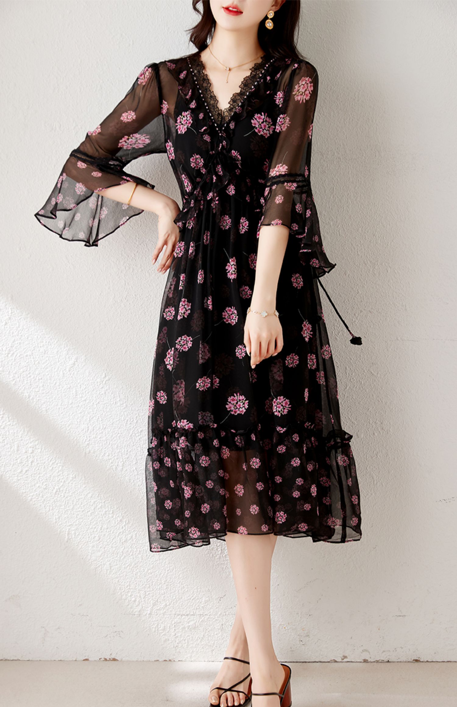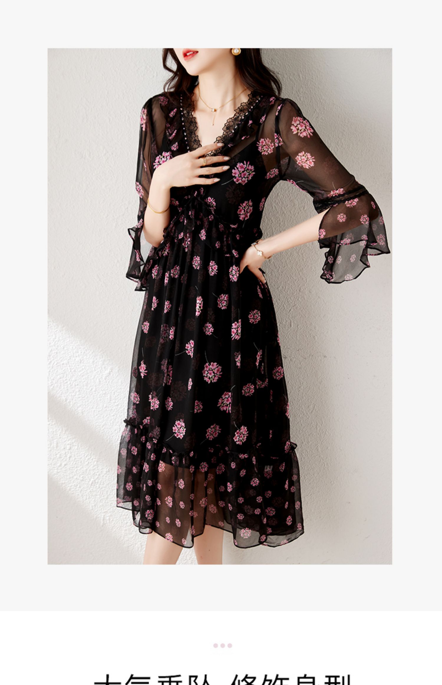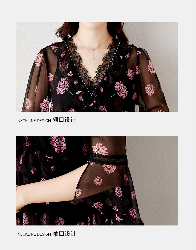 玖詩婭時尚女裝桑蠶絲連衣裙奢華品牌黑色蕾絲真絲時髦氣質高級感
