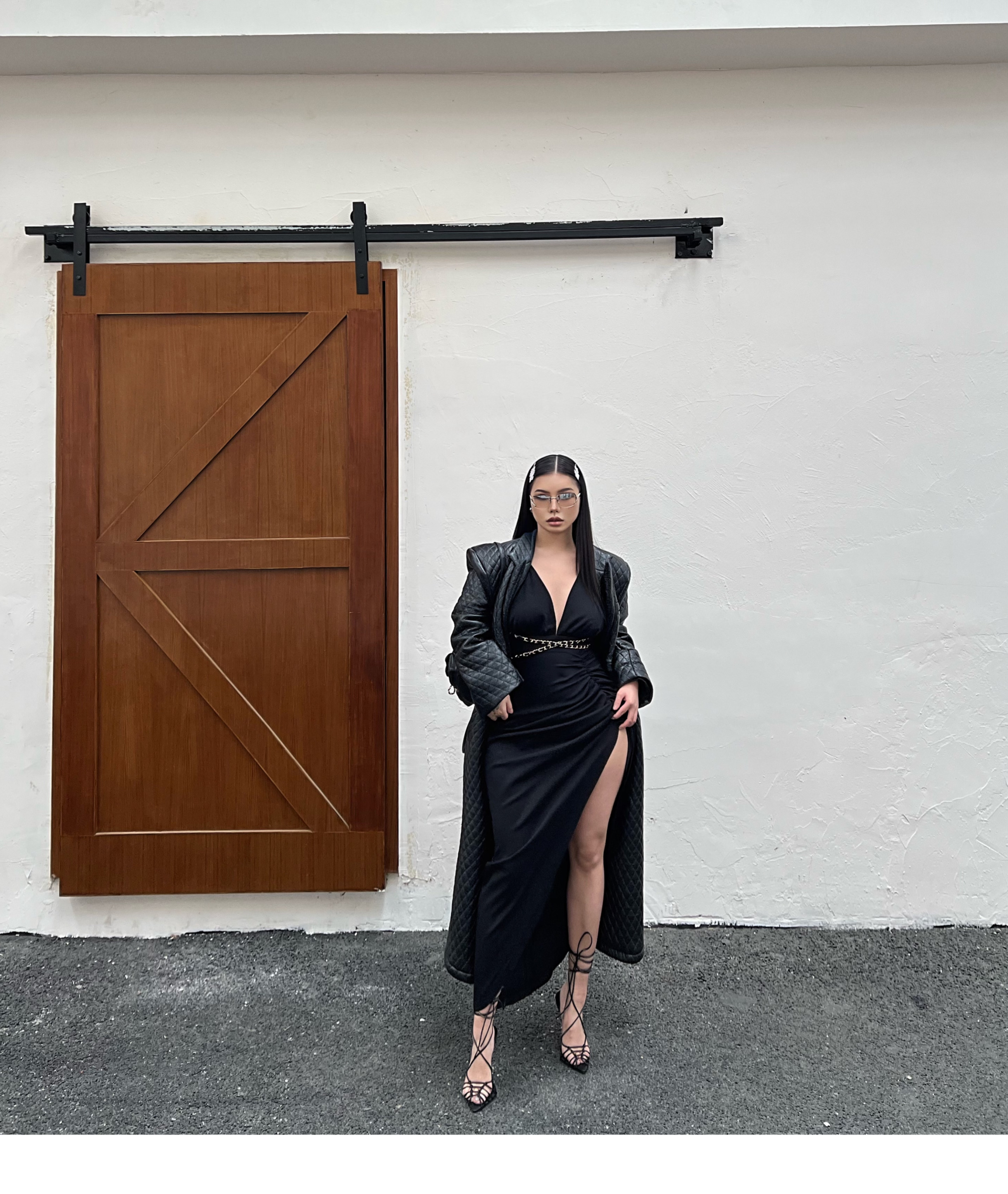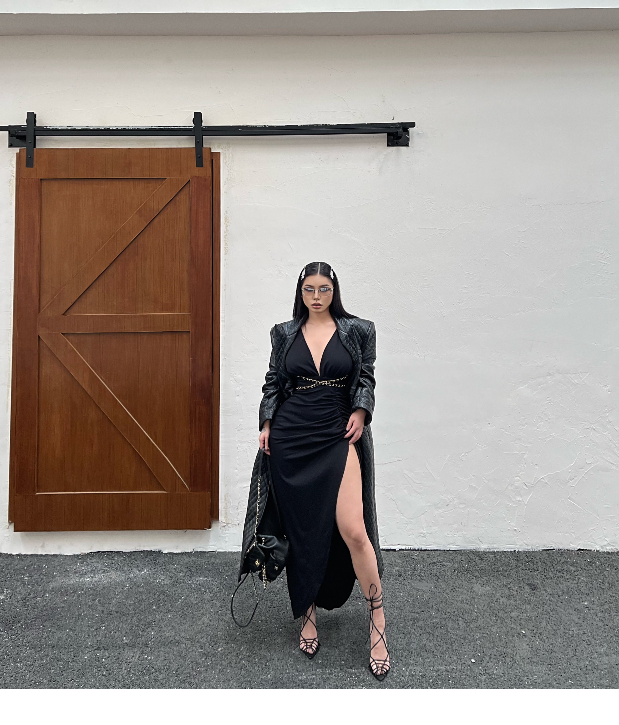 SYNEZS新款歐美性感辣妹露背深V金屬鏈條抽褶開衩連衣裙