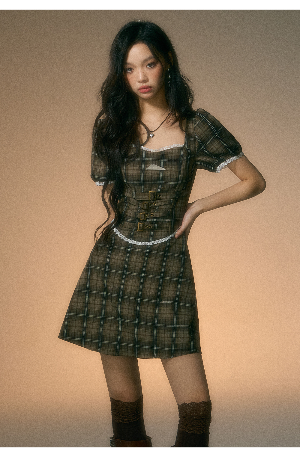 PTWOP ONLINE熱戀情節 泡泡袖格子連衣裙子女夏季短款裙子顯瘦