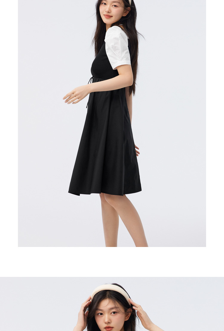 森馬連衣裙女修身撞色泡泡袖2023夏季新款抽繩小黑裙黑白拼接中裙