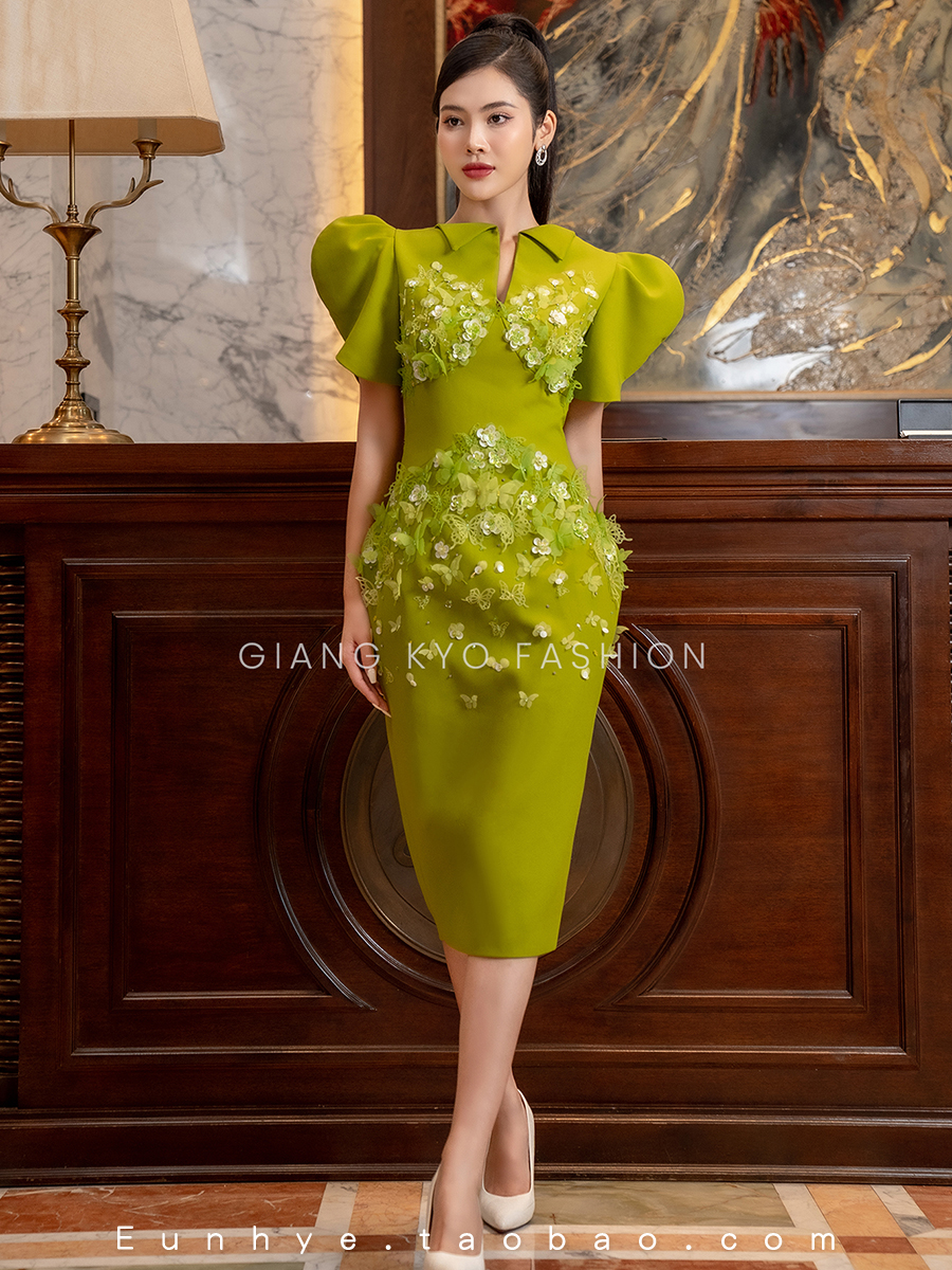越南小眾品牌GIANGKYO 2023年夏季新款顯白鮮草綠蝴蝶氣質連衣裙