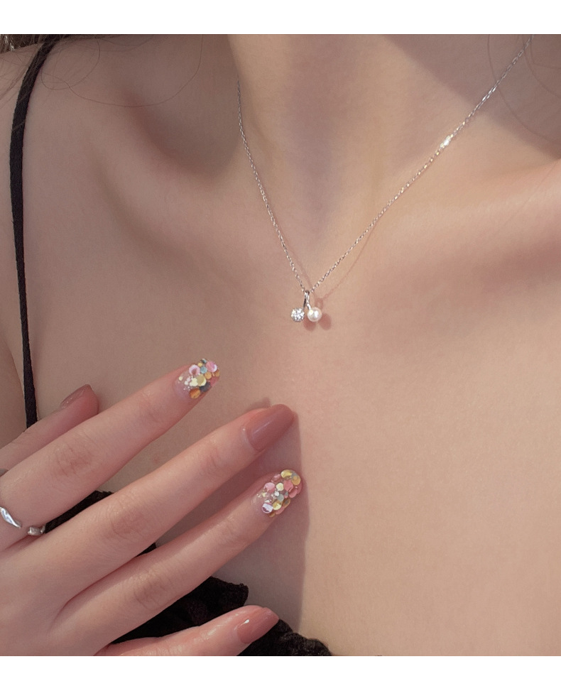 S925純銀鑲鉆珍珠櫻桃項鏈鎖骨鏈女款韓版氣質設計感輕奢高級百搭