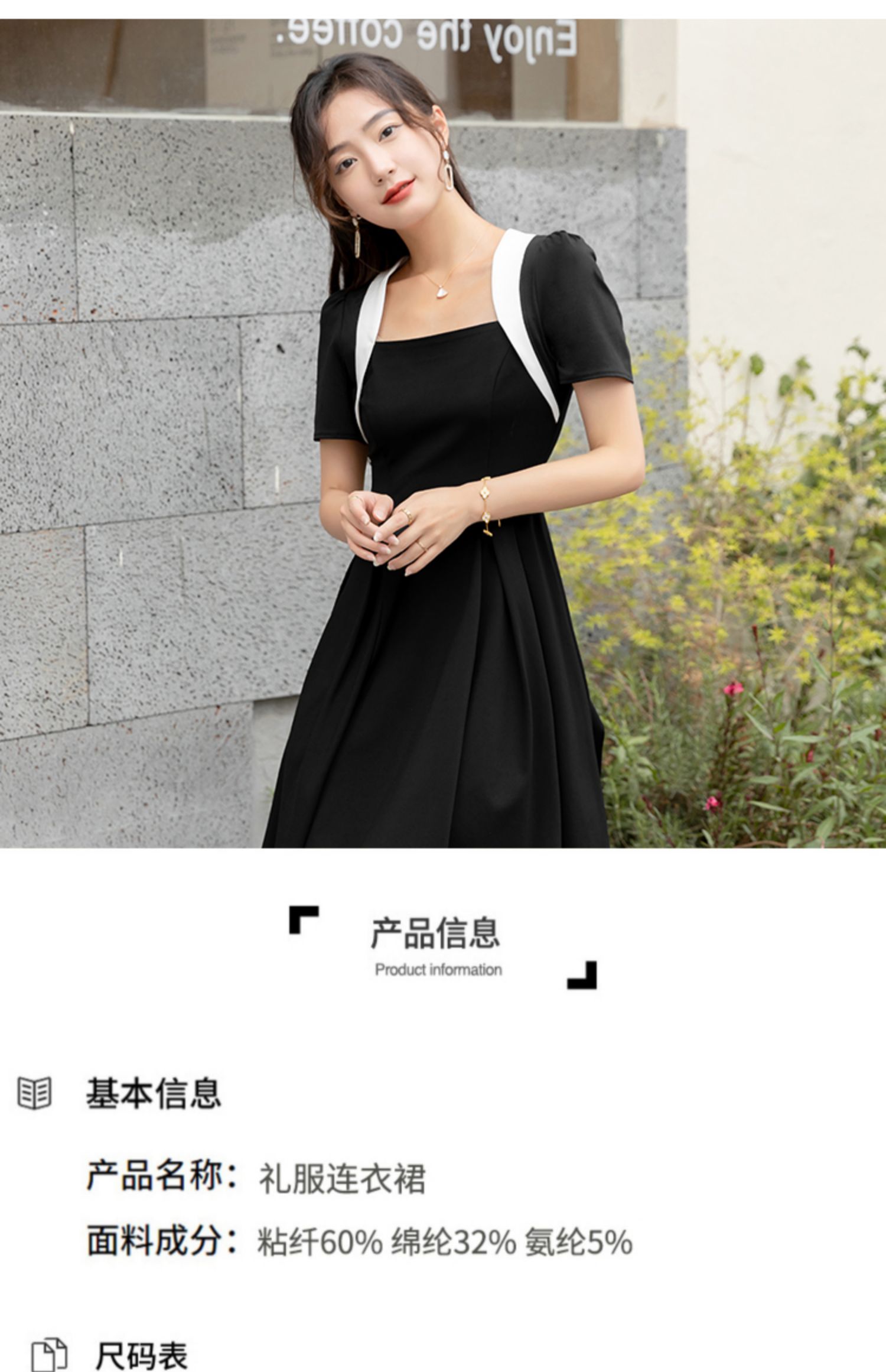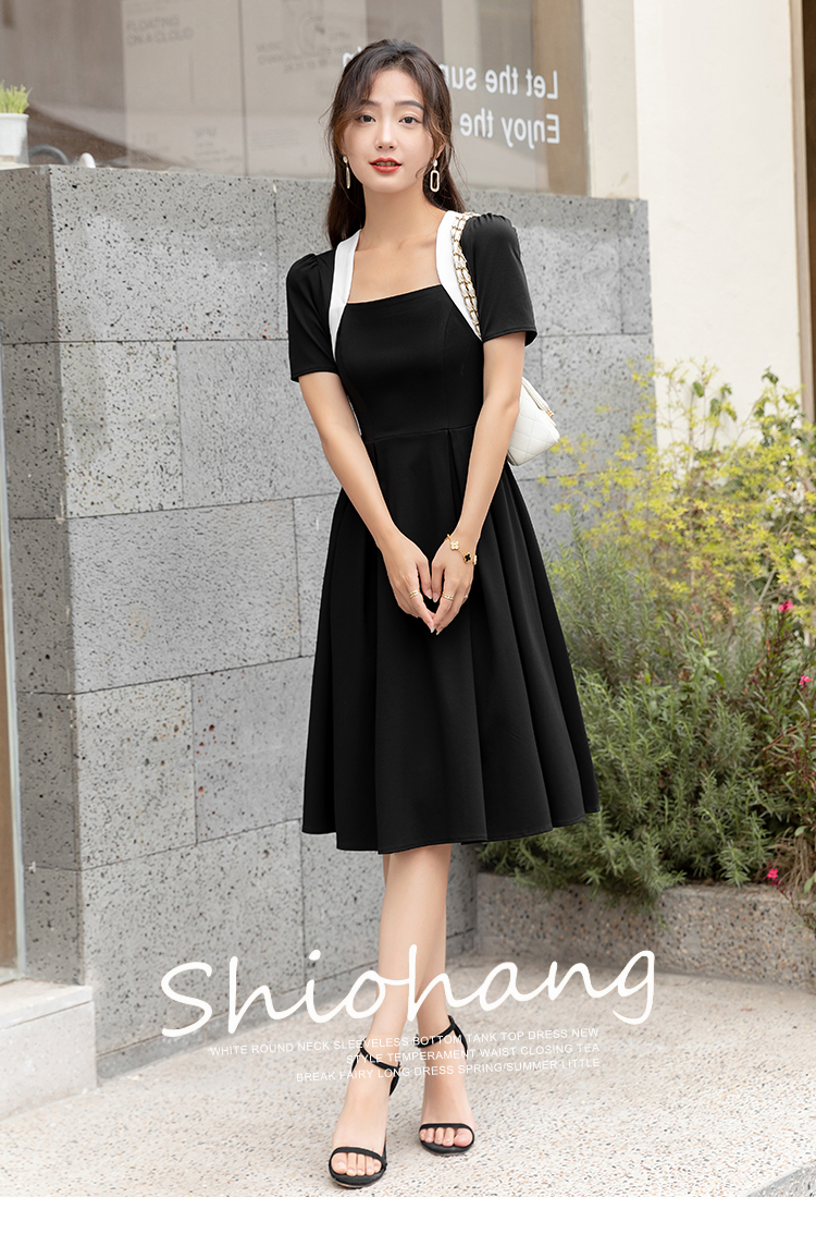 2023年新款法式方領短袖設計感氣質赫本風長款裙子黑色連衣裙女夏