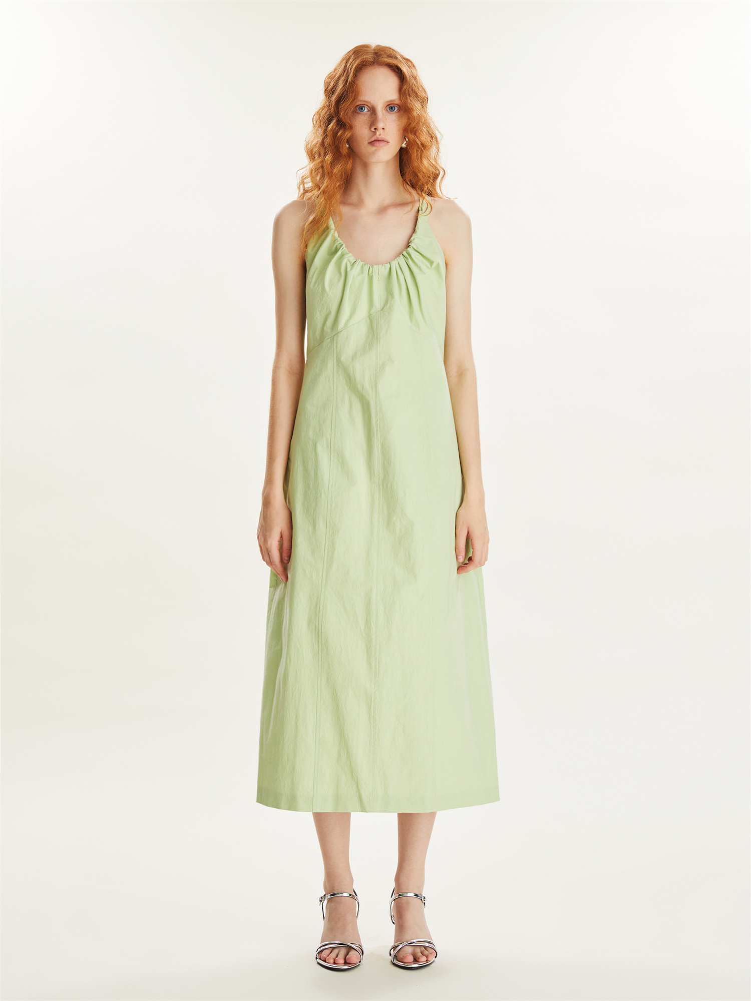 square circle方圓清新夏日蘋果綠抽皺綁帶法式連衣裙女氣質長裙
