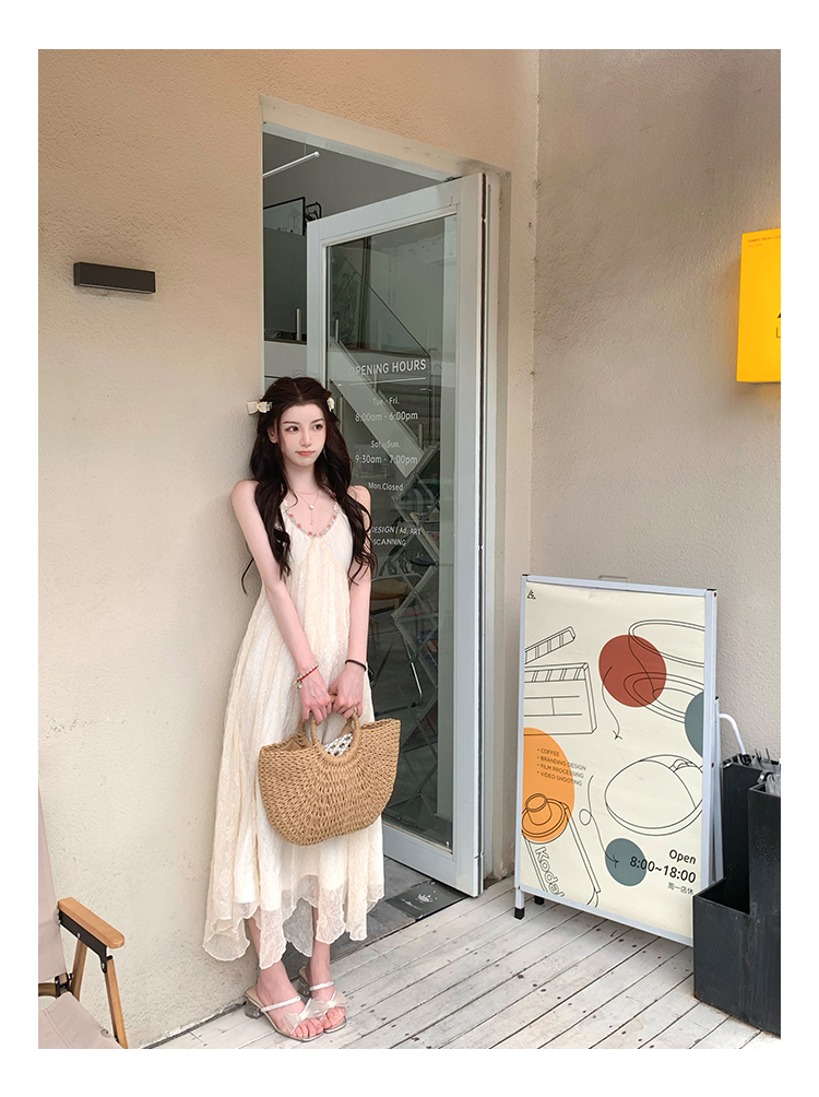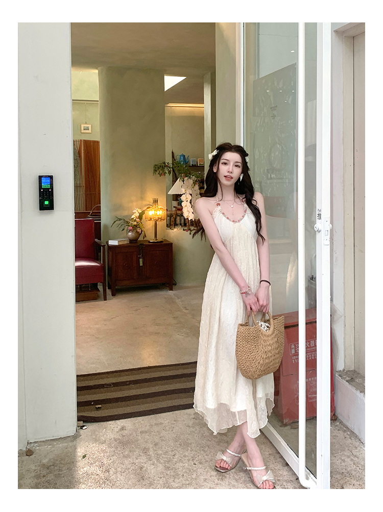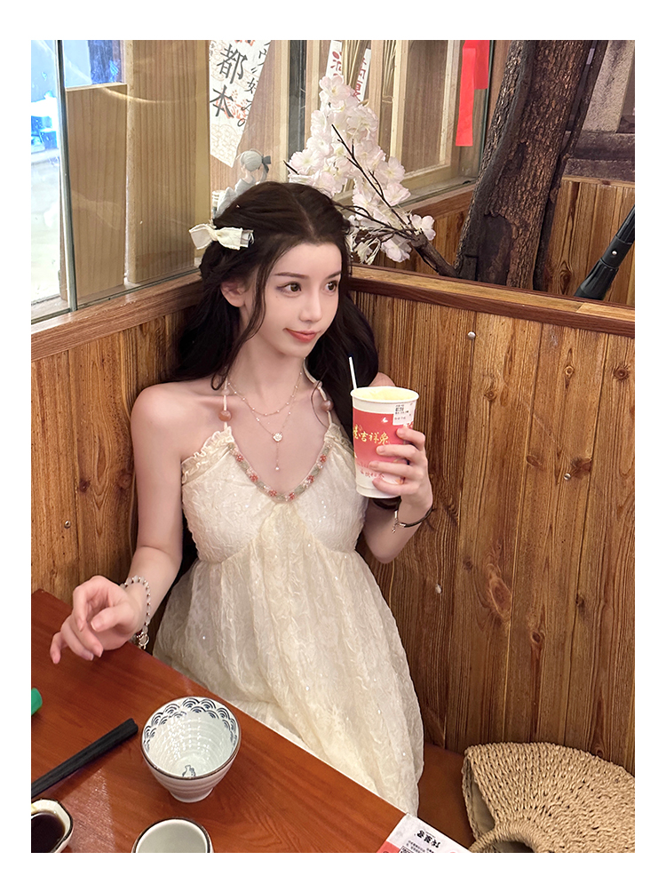 米白色給大家胸前鑲嵌了粉色水晶花邊