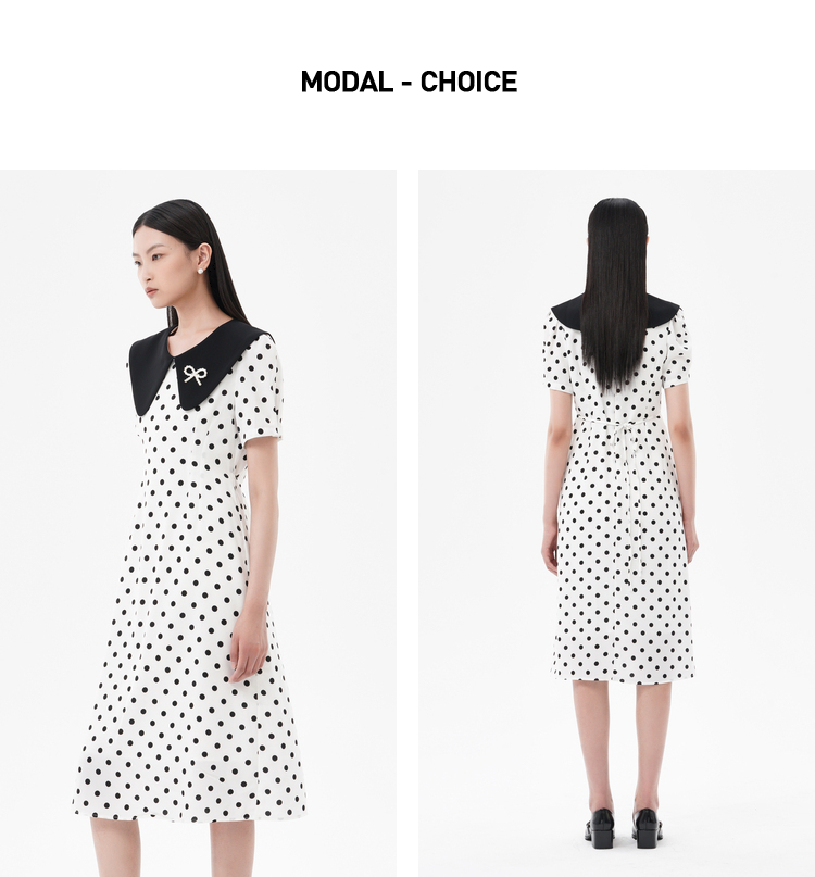 飄蕾波點連衣裙女2023夏季新款通勤法式復古撞色翻領收腰顯瘦中裙