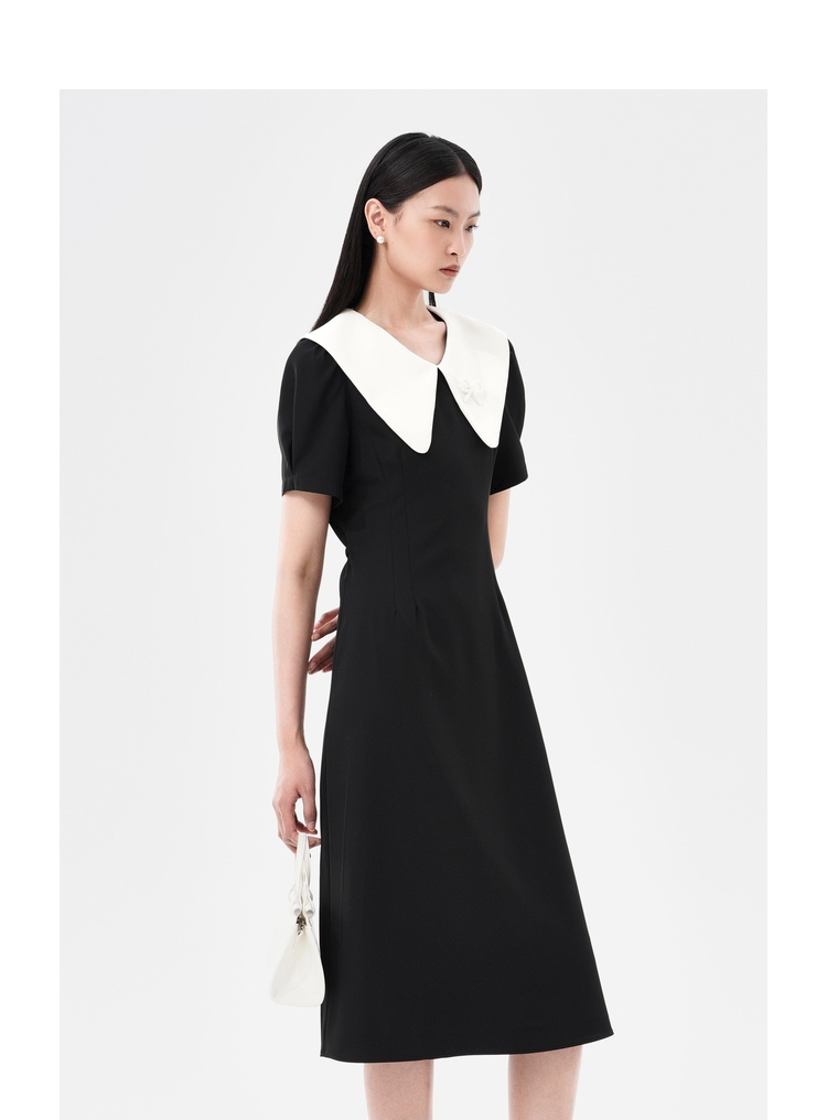 郭九九呢棉質黑色圓領長袖修身顯瘦名媛打底連衣裙女秋設計感長裙