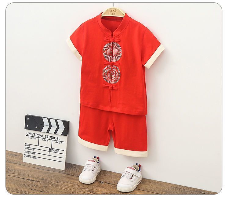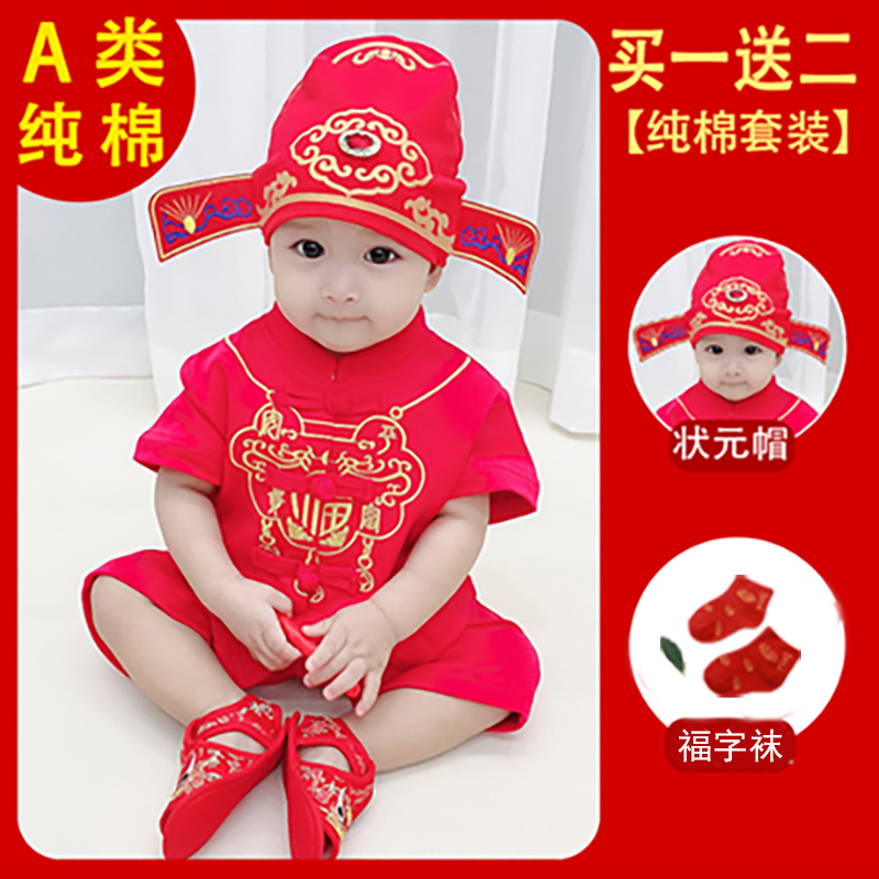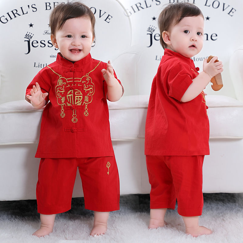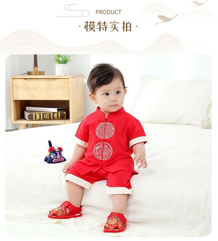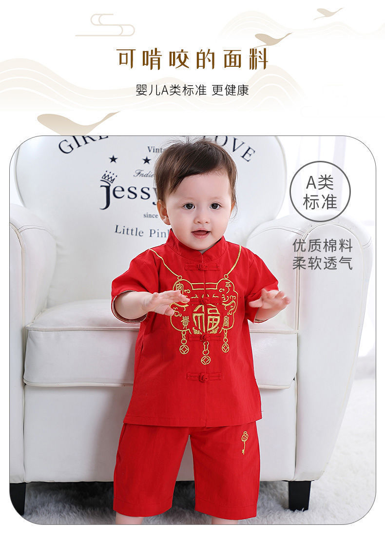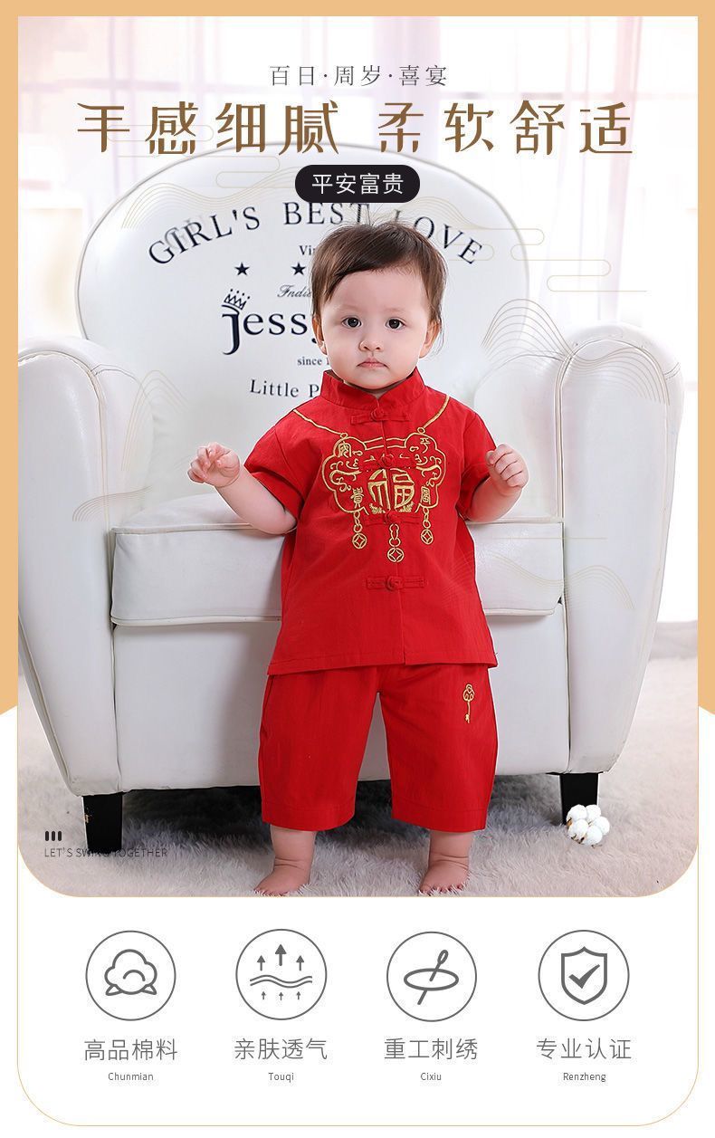 抓周男寶寶紅色純棉一周歲夏款禮服