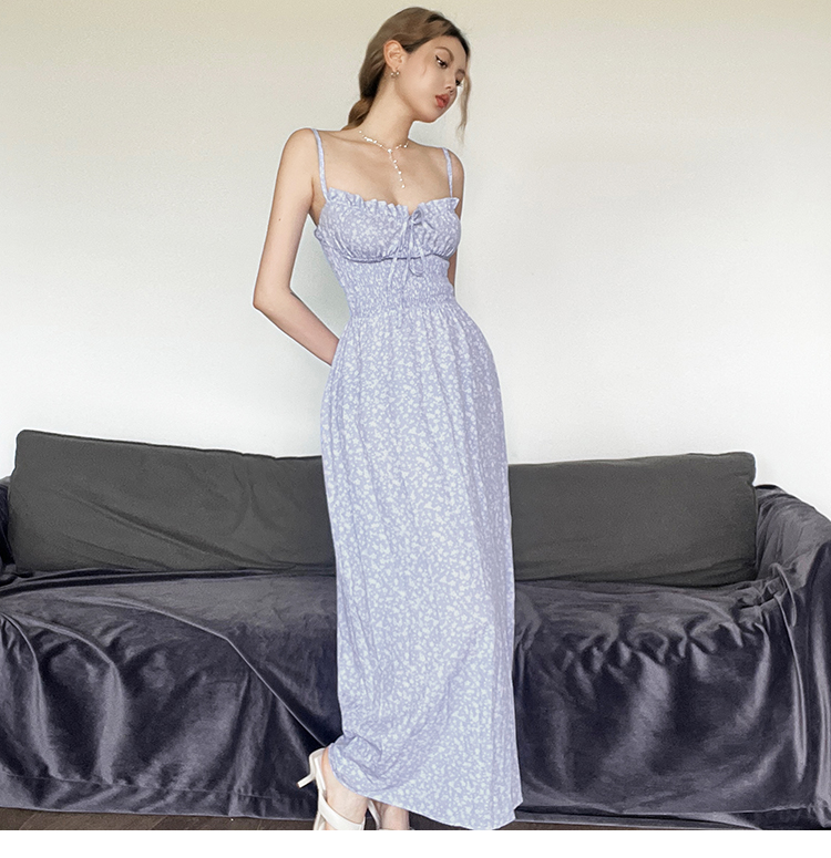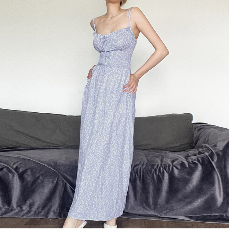 WEIRD PUSS 歐美氣質優雅慵懶風清新少女收腰吊帶連衣裙碎花長裙