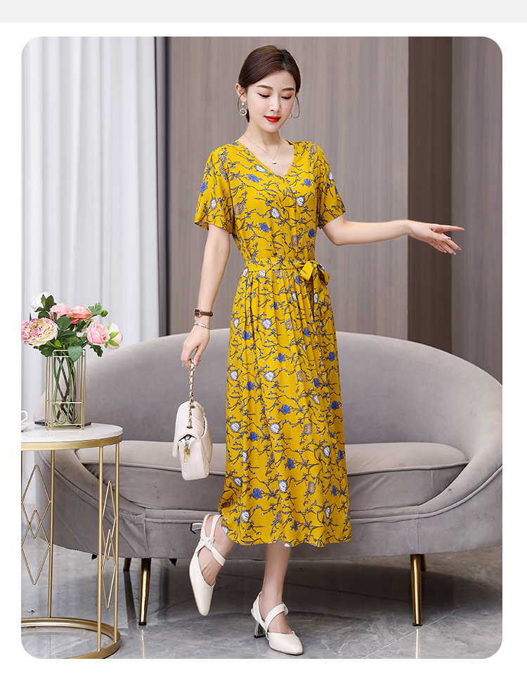 夏季時尚新款人造棉抽繩碎花連衣裙