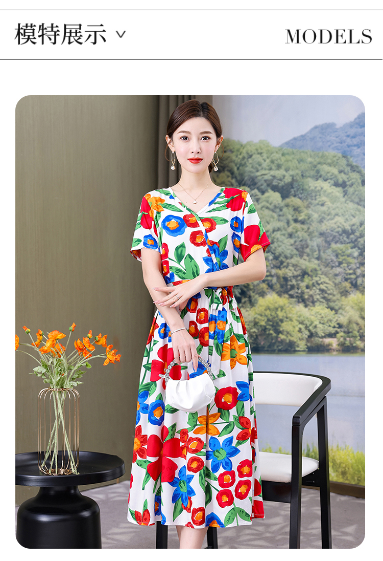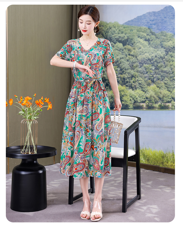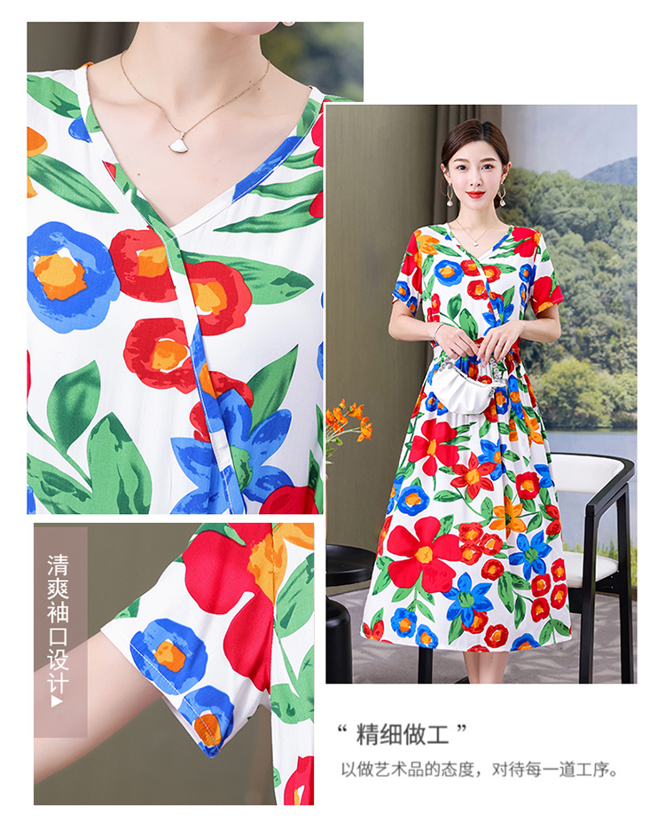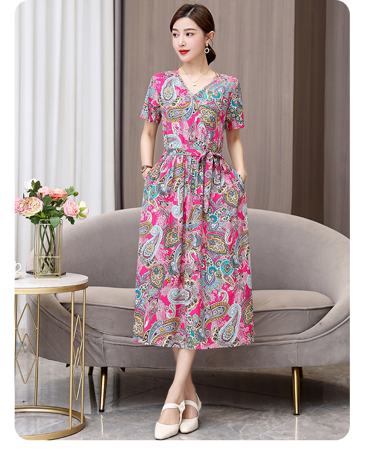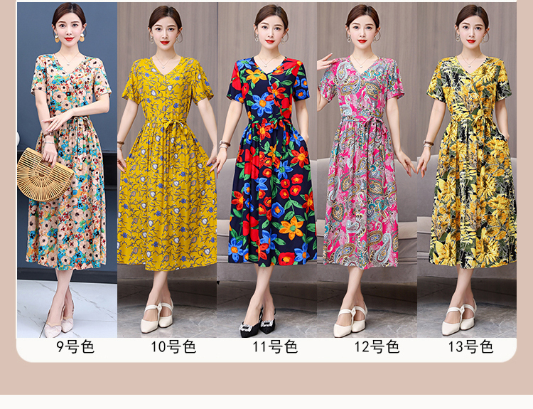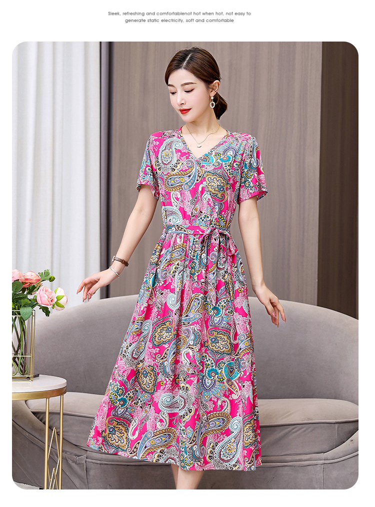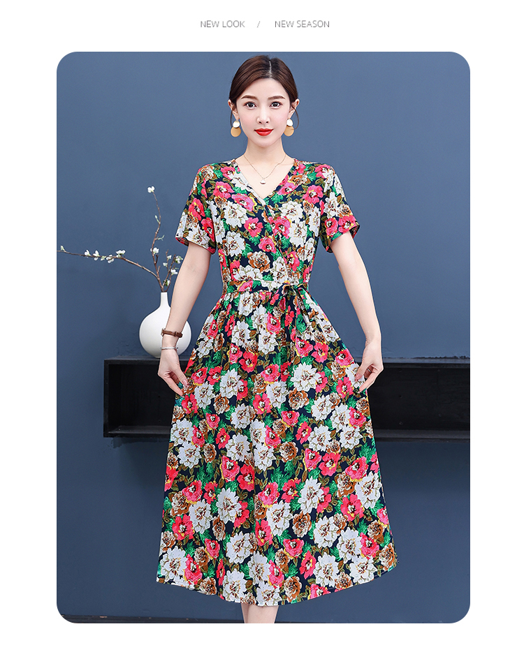 新款氣質棉綢連衣裙女夏季時尚大碼人造棉印花裙子薄款沙灘長裙