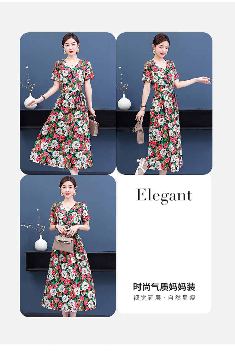 媽媽洋氣碎花連衣裙女2023新款大碼中老年人高貴氣質過膝短袖裙子