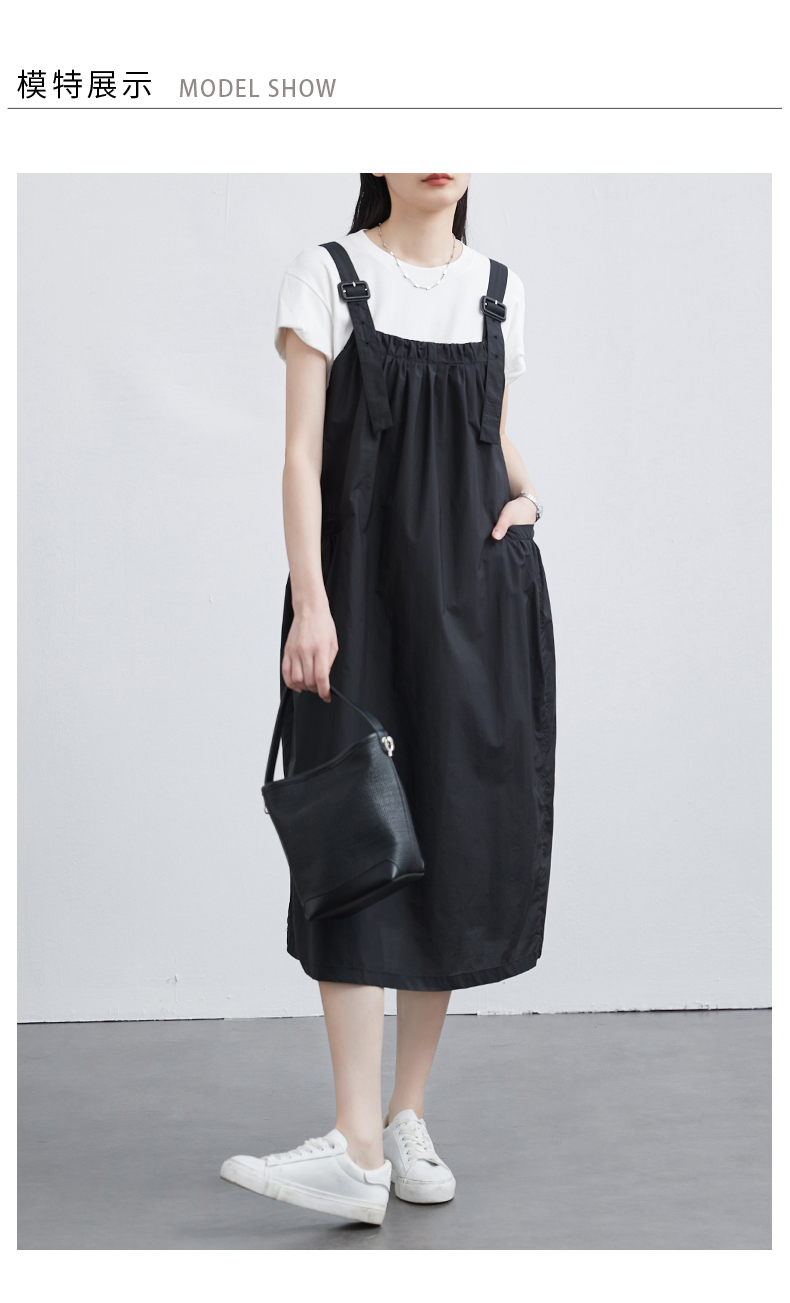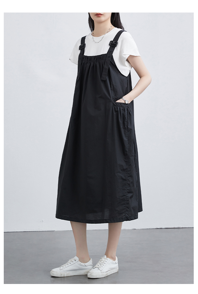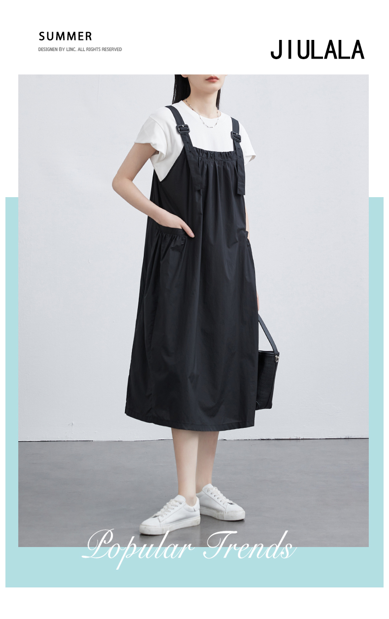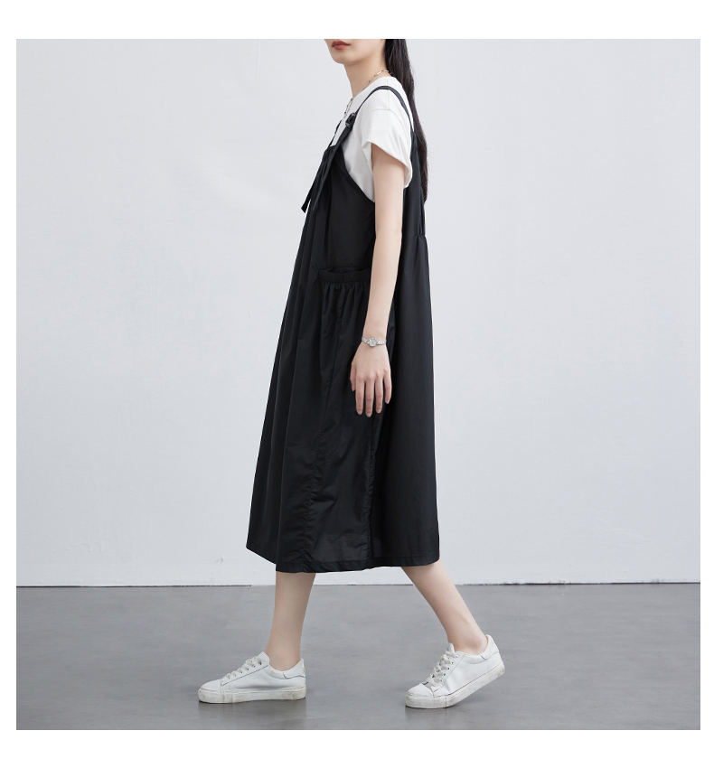 黑色可調節吊帶裙女2023夏季新款無袖休閑顯瘦寬松腰中長款連衣裙